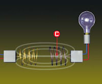 The energy of the oscillating magnetic field induces an electrical current in the receiving coil, lighting the bulb [D].
