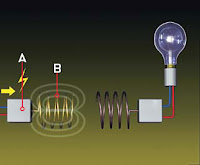 A circuit [A] attached to the wall socket converts the standard 60-hertz current to 10 megahertz and feeds it to the transmitting coil [B]. The oscillating current inside the transmitting coil causes the coil to emit a 10-megahertz magnetic field.