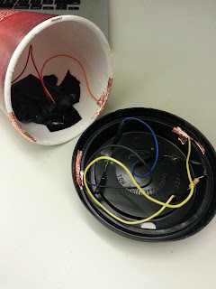 Firstly, I attached a 9 volt battery inside the cup. I made the ground connect to one side and the power to another. I also used to copper wire as the switch, and in some way, glue for the wires.