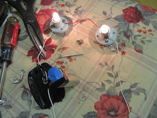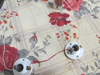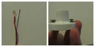 First, strip 3/4 of an inch of the plastic casing from both ends of a 7 inch piece of wire and the 5 inch piece of wire, as shown in the photo above. With you flat head wrench, loosen the two screws on either side of the lamp holder, just enough for you to be able to tie the wire around it . Next, twist the copper tip of one piece of wire firmly around one of the screws of the lamp holder, then retighten the screw. Do the same thing to the other screw of the lamp holder.