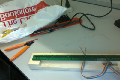 Step 3: As said previously when you got your ruler wood frame lead the wires through the hole then I was able to start soldering.