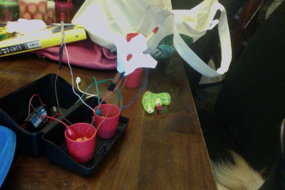 Using two small buckets but two cut circular wet sponges(one sponge would have to be ground “neg” and one “pos”) with and make sure to stab the wires through the sponge so it won’t be too lose and fall out.(The wires to make it stand had to be very sturdy wires and so the previous wires was replaced.)