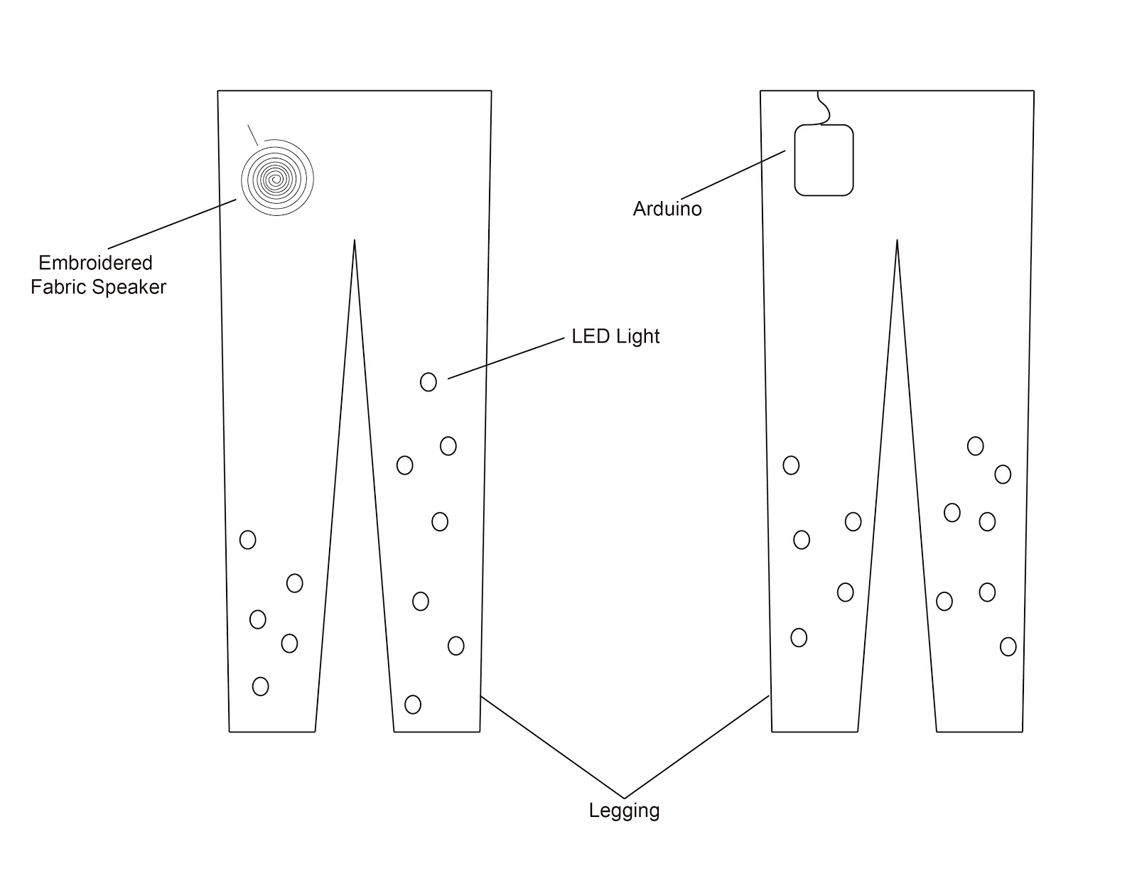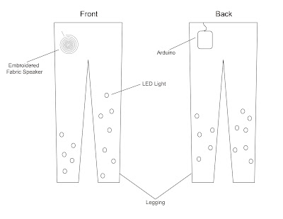 My idea is adding LED lights and a embroidered fabric speaker which I saw on the example links on legging. I think it is interesting that having your own speaking on the pants so that you can dance when ever you want, and with LED lights make the legging more visually compelling. I plan to use the sound sensor to activate the lights, so the LEDs can light up the sound which comes out from the speaker. The speaker will connect to the Arduino board or lilypad, and the Arduino board will link to a music player.