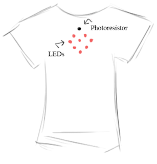 So, I want to make a heart shirt that lights up with LEDs! I’d put a photoresistor above the heart, so it would react to the light conditions around you. I also like using a photoresister because if someone were to walk closer and closer to you, the light would get brighter. If someone hugs you, it’d be glowing the brightest, and the heart would show how happy you are! I’d put the Arduino in a jacket for easy pocketing. The wires that connect to the LEDs will be wired behind the jacket, and then looped into the shirt and around. The jacket should cover all wires and such, so no one would see them.
