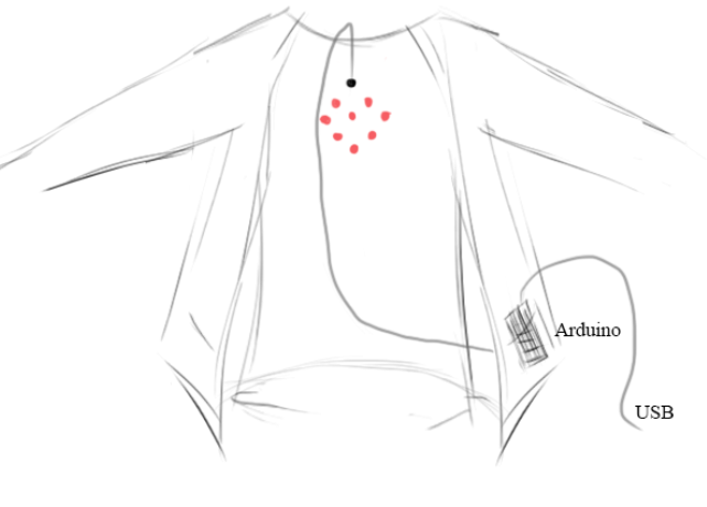 So, I want to make a heart shirt that lights up with LEDs! I’d put a photoresistor above the heart, so it would react to the light conditions around you. I also like using a photoresister because if someone were to walk closer and closer to you, the light would get brighter. If someone hugs you, it’d be glowing the brightest, and the heart would show how happy you are! I’d put the Arduino in a jacket for easy pocketing. The wires that connect to the LEDs will be wired behind the jacket, and then looped into the shirt and around. The jacket should cover all wires and such, so no one would see them.