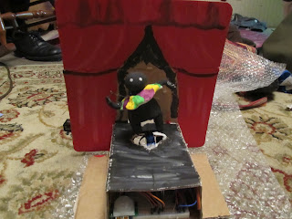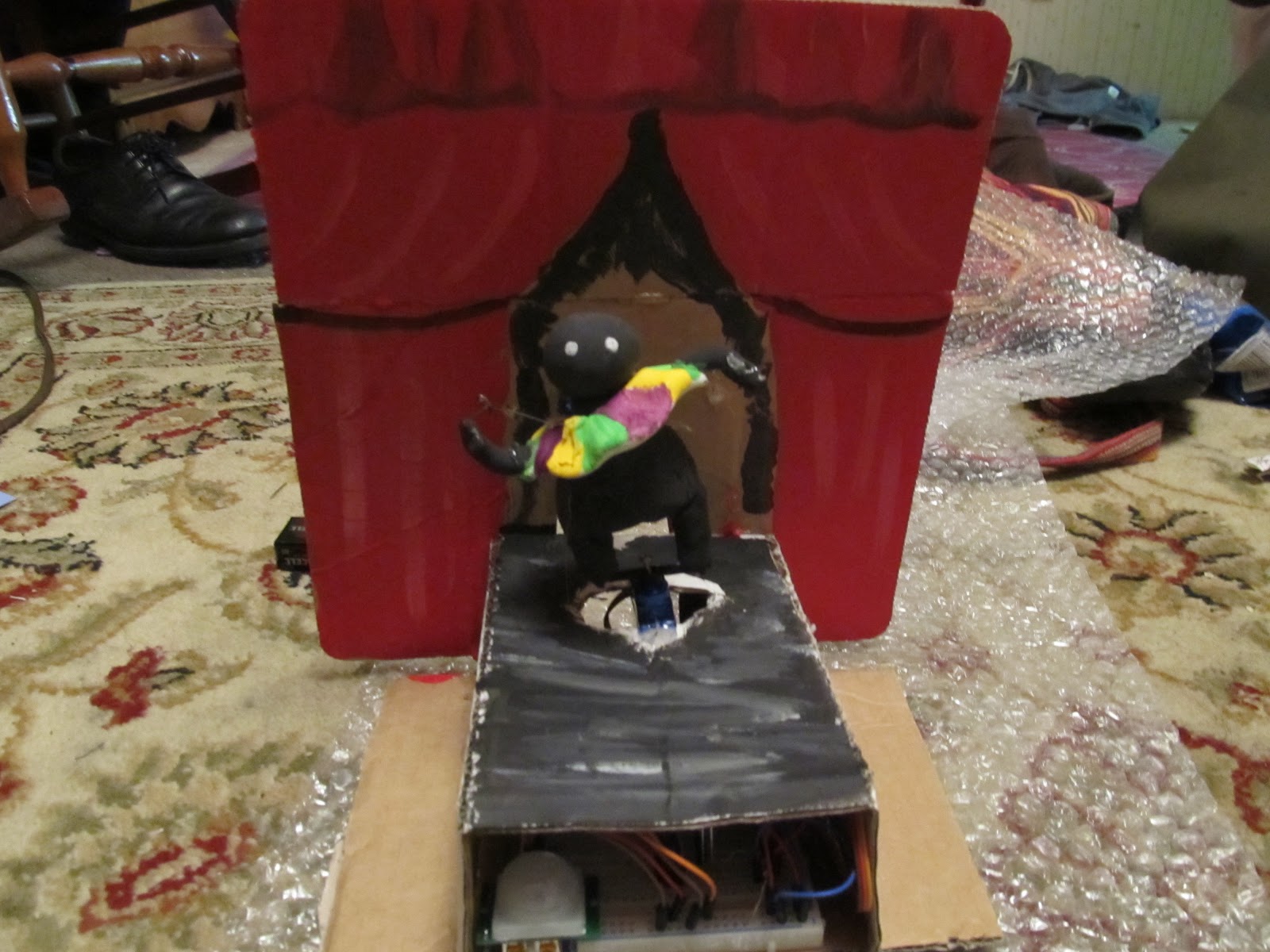Past Student Work Final Project: A Very Nervous Dancer Posted by Sabrina on December 6, 2012 Here are photos of my final project. In these photos are my PIR Sensor, the top and bottom servo motors, and how they interact with the model. Bridget Miller