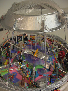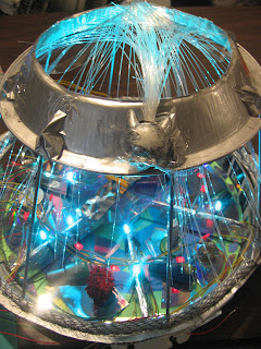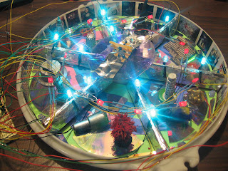 My project is an international futuristic art world both a representation of the art of the past, present, and future. I have figures of Big Ben, the Leaning Tower of Pisa, the Eiffel Tower, the Pyramid of Cholula, and the Statue of Liberty and various sculptures that I made for the piece. It is my interpretation and imagination of a futuristic art world that embraces artworks of the past and present and into the future. I ran into issues along the way in getting the array to work while getting the fade part of the LEDS to go on for the button mechanism. The LEDS for the fade would blink instead of fade for their part. I also had a mechanical issue in getting secure contact with the lid and the tray, so after rewiring to power and ground I was able to have the connection function properly. In this way, I can not entirely take the lid off of the tray since the wires are connected on the breadboard. This is the just one of things I would change in having more copper tape so it can have that immediate connection and be much easier to handle. I also would change the wiring of all the leds because it is a lot of wire to work with. I did try to eliminate as much as I could as I did have a lot of wires before. I know originally I wanted to have a motor and a song for when the dome goes off, but I was really focusing on getting the array and fade to work. I would have at least liked to put in the flag to have it spin by the motor. For much of this project, I was inspired by the many electronic and media works throughout the course that I was exposed to. Even though I didn’t add in the music box aspect, that was an idea of receiving music boxes myself from my grandma and grandpa as a child.