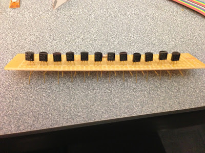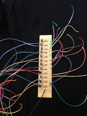 This is my final porject which is a garment with LED strip that responses to the sound. It is kind of similiar to my last project. The differences between these two are the way they respone to the sound, the LED lights, and the circuit. My last project response to the sound with a ramdom pattern, and the LED light up several times after the sensor receives sound. This project has a straight pattern which the LED light up down line to the up line. I used two shift registers in my last project to connect 16 LED lights. In the final project, I chose to use LED stripe which are arranged to 12 lines.