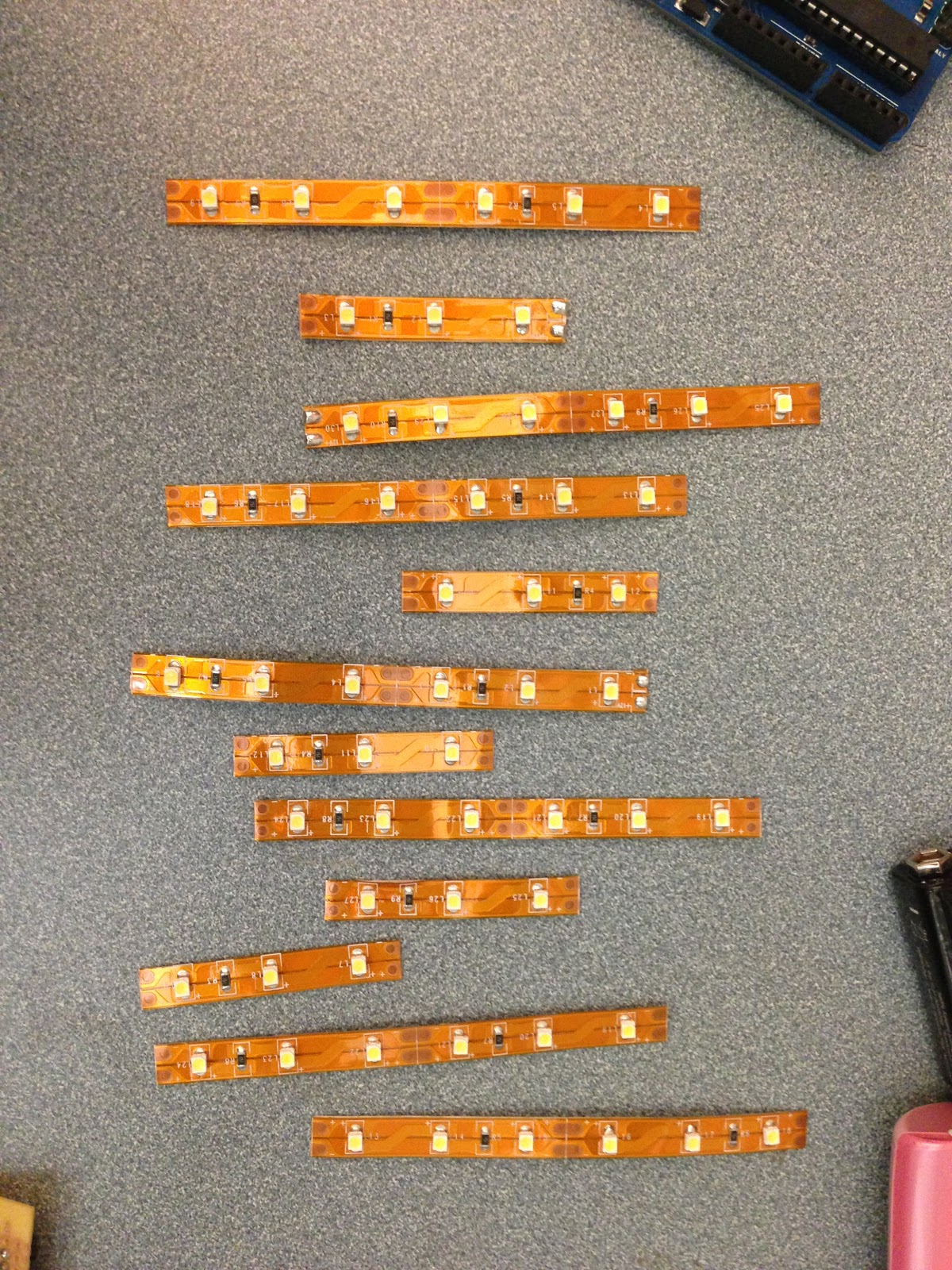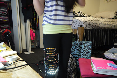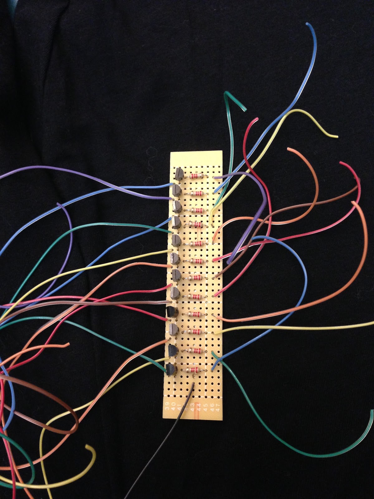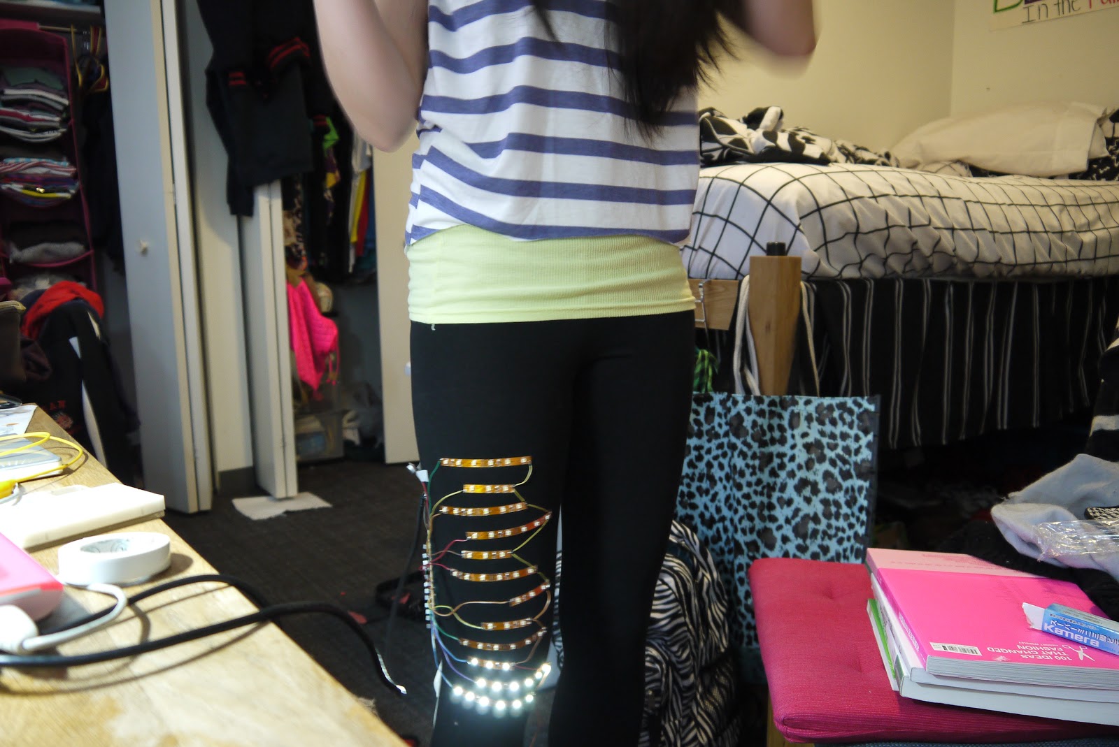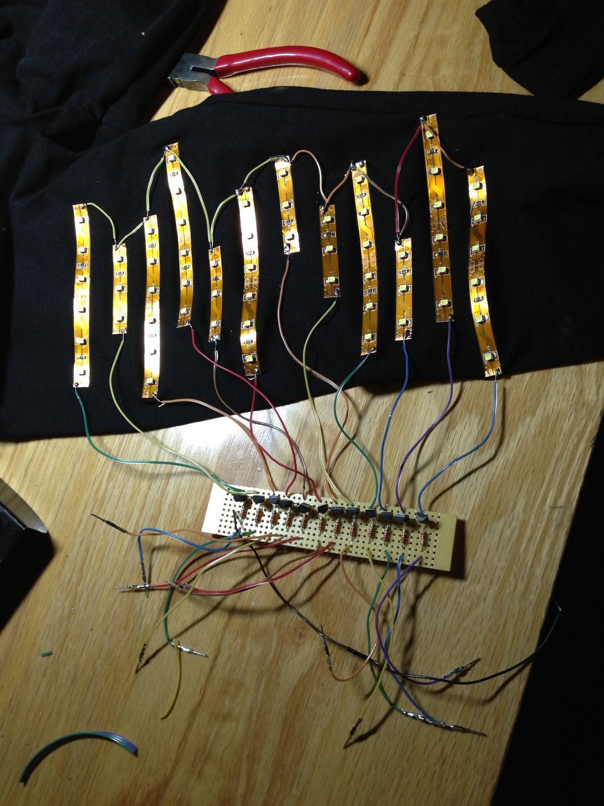 This is my final porject which is a garment with LED strip that responses to the sound. It is kind of similiar to my last project. The differences between these two are the way they respone to the sound, the LED lights, and the circuit. My last project response to the sound with a ramdom pattern, and the LED light up several times after the sensor receives sound. This project has a straight pattern which the LED light up down line to the up line. I used two shift registers in my last project to connect 16 LED lights. In the final project, I chose to use LED stripe which are arranged to 12 lines.