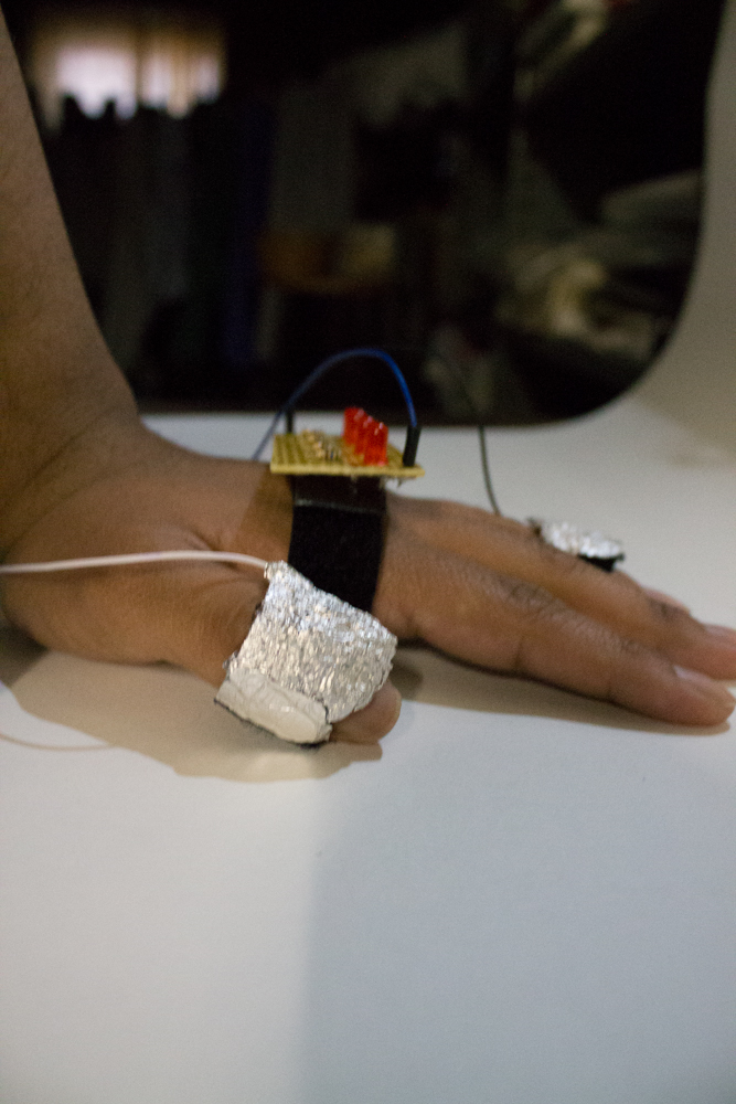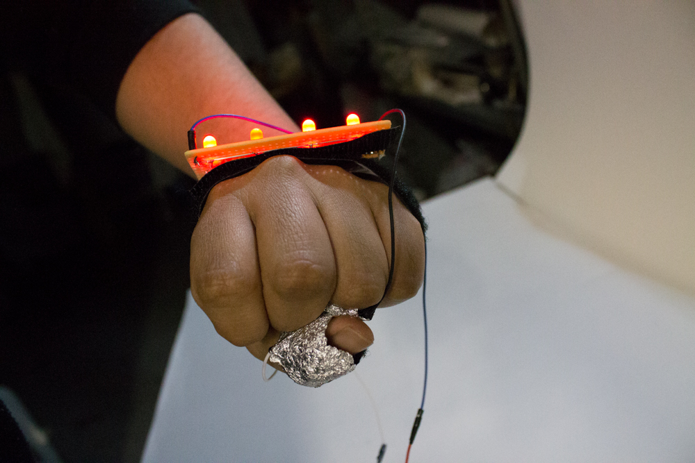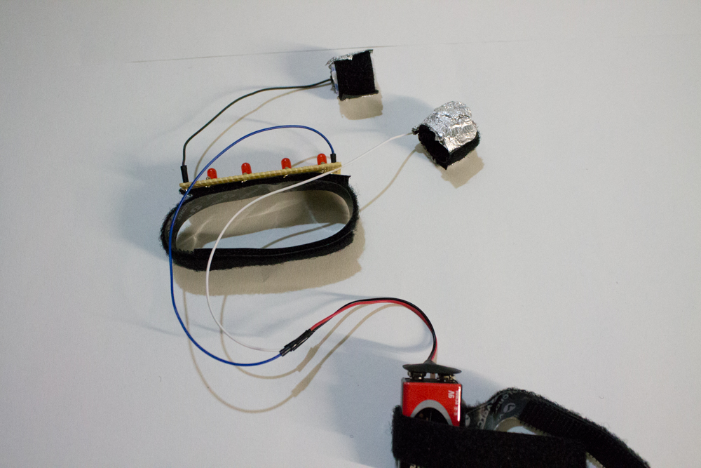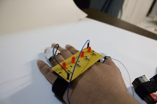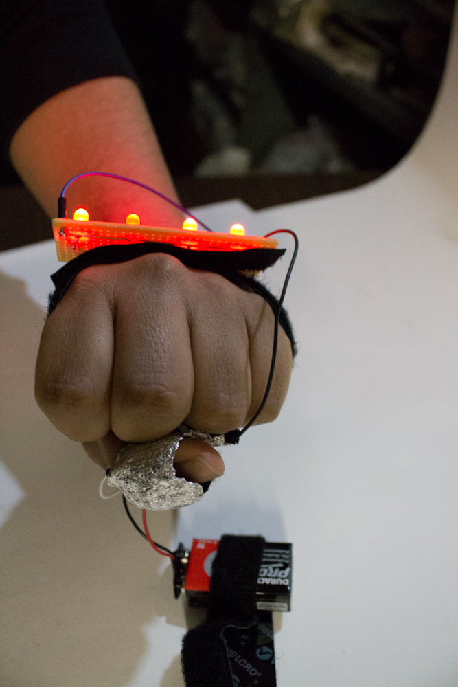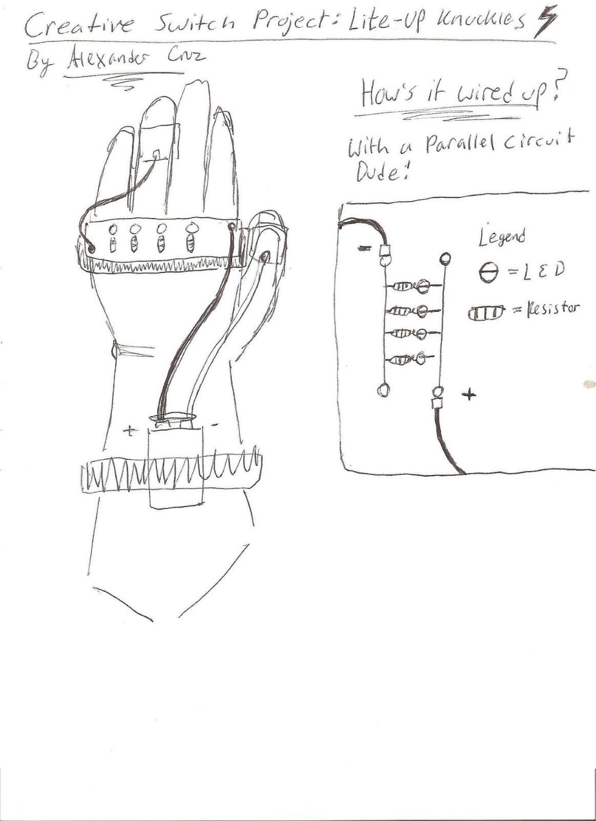 My project consists of a row of L.E.D.’s on a chip board on my knuckles that light up when i make a fist. The L.E.D.’s are set up in a parallel circuit to ensure that each light receives enough power. The way it lights up is through connecting the two negative wires to complete the system. The positive wire is directly linked to the knuckles with no interference. However the negative wires are a different case. One negative wire is connected to the knuckles but is not connected to the power source, the other wire (also negative) is connected to the power source but not the knuckles. To complete the circuit you need to touch both ends (both attached to a finger and thumb) which conveniently meet when a fist is formed thus lighting up the L.E.D.’s Unfortunately, it cannot be used for super heroics or super villainy no matter how much the appearance says otherwise.