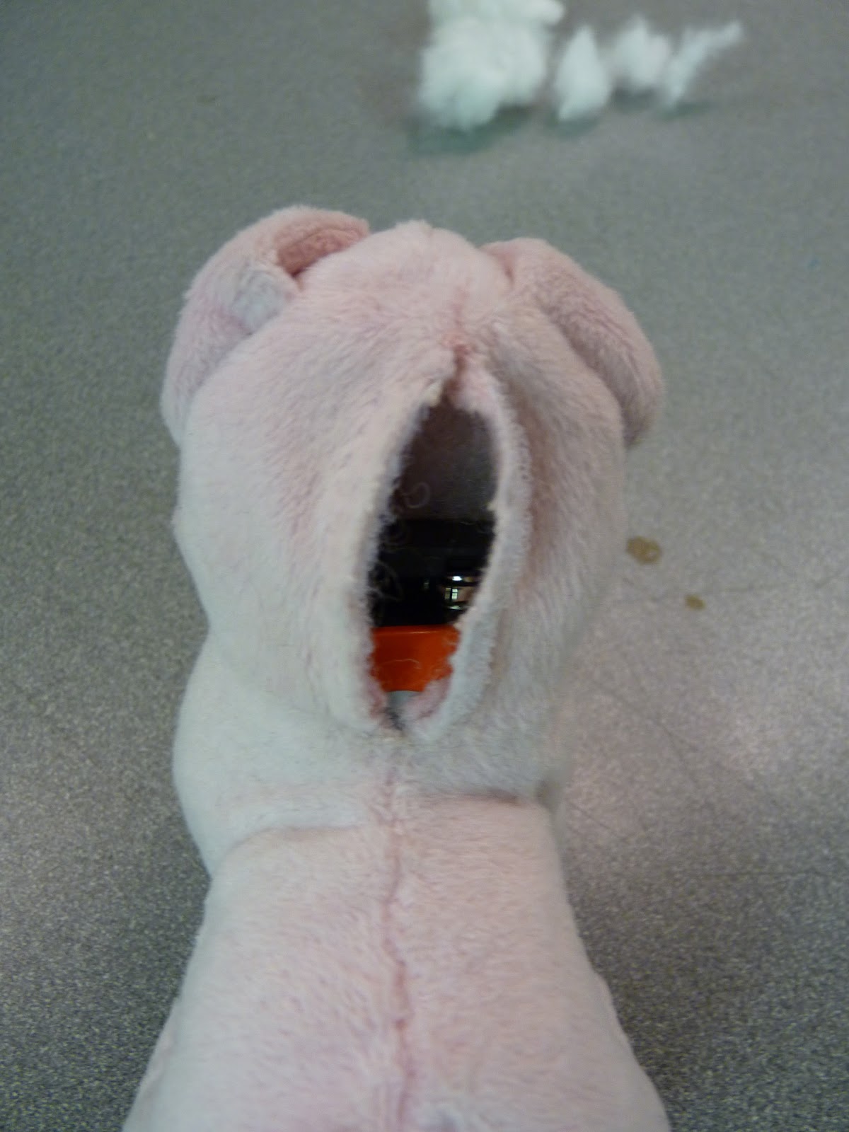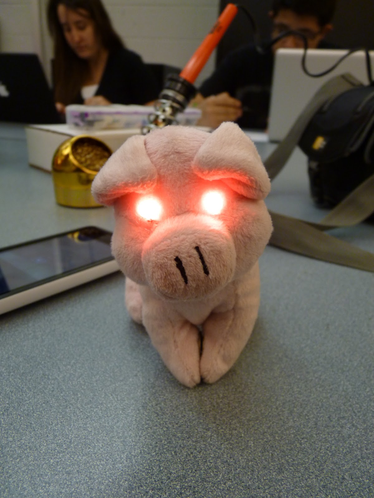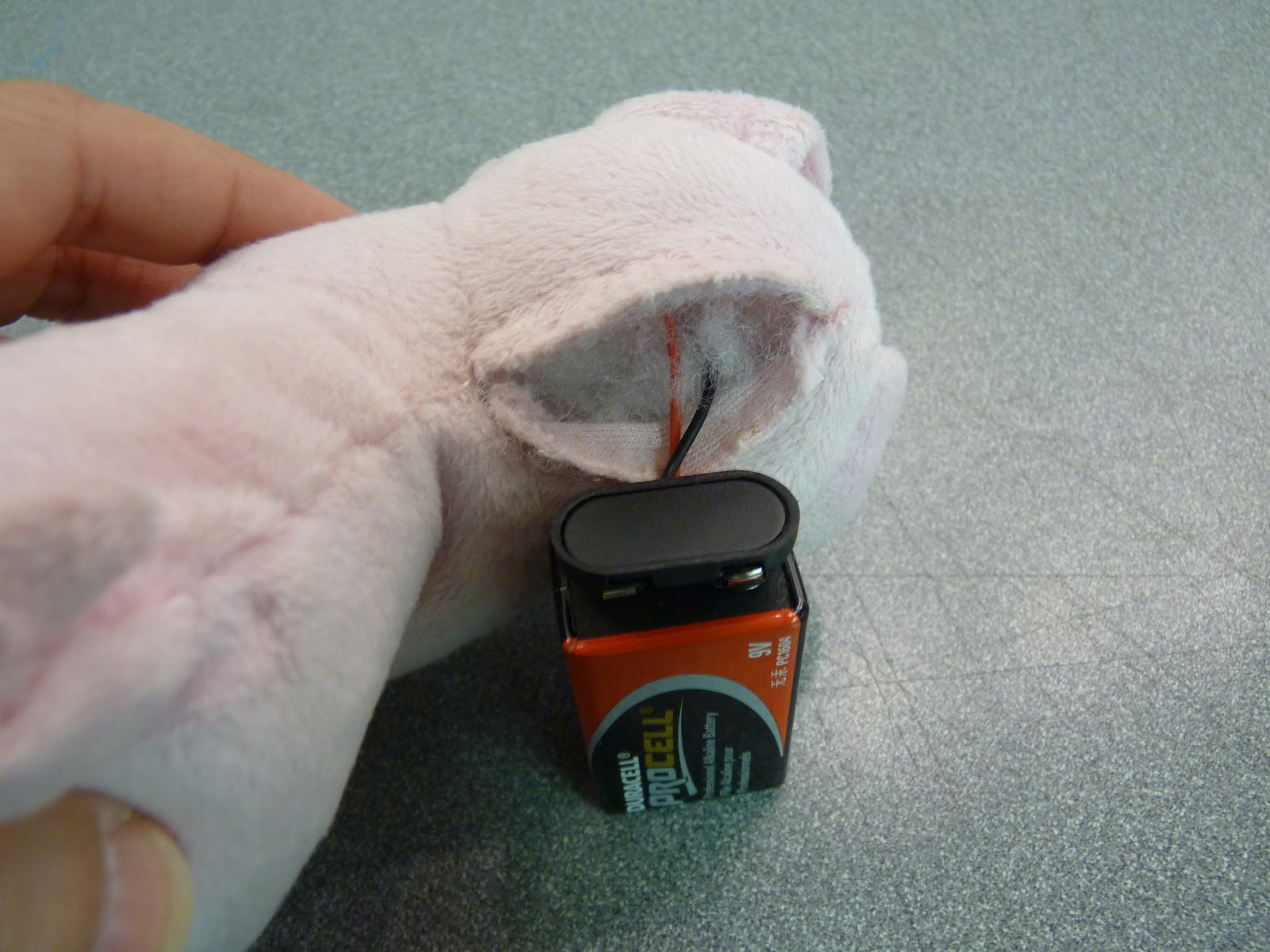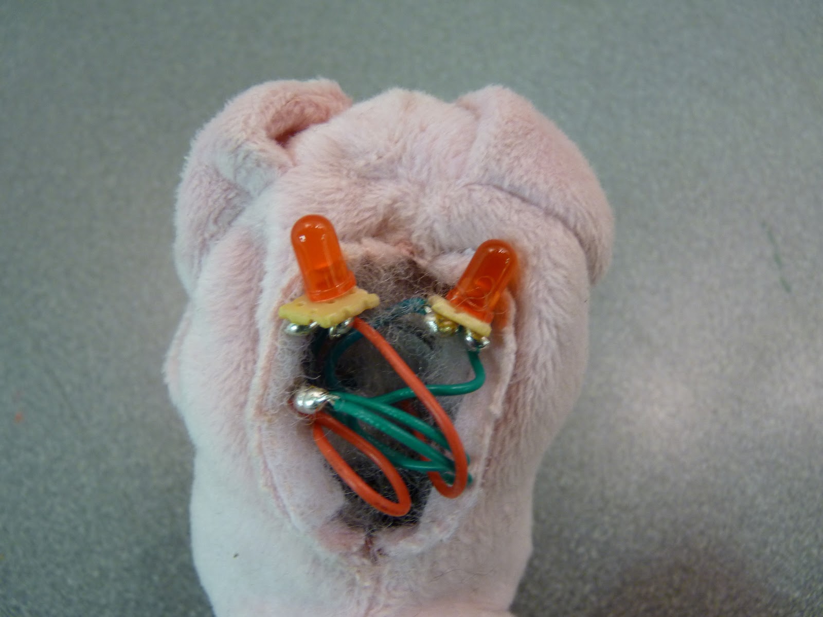 The Evil Pig stuffed animal uses brass snaps on its feet to complete the circuit to light the LEDs. The LEDs are connected in series to each other with a resistor and are powered by a 9-volt battery that rests in the belly of the pig. The negative lead to the battery is connected to the back of one of the brass snaps in a leg and the wire from the LEDs extends through the other leg of the pig attached to a brass snap. When the two snaps touch, it completes the circuit and lights the eyes of the pig.