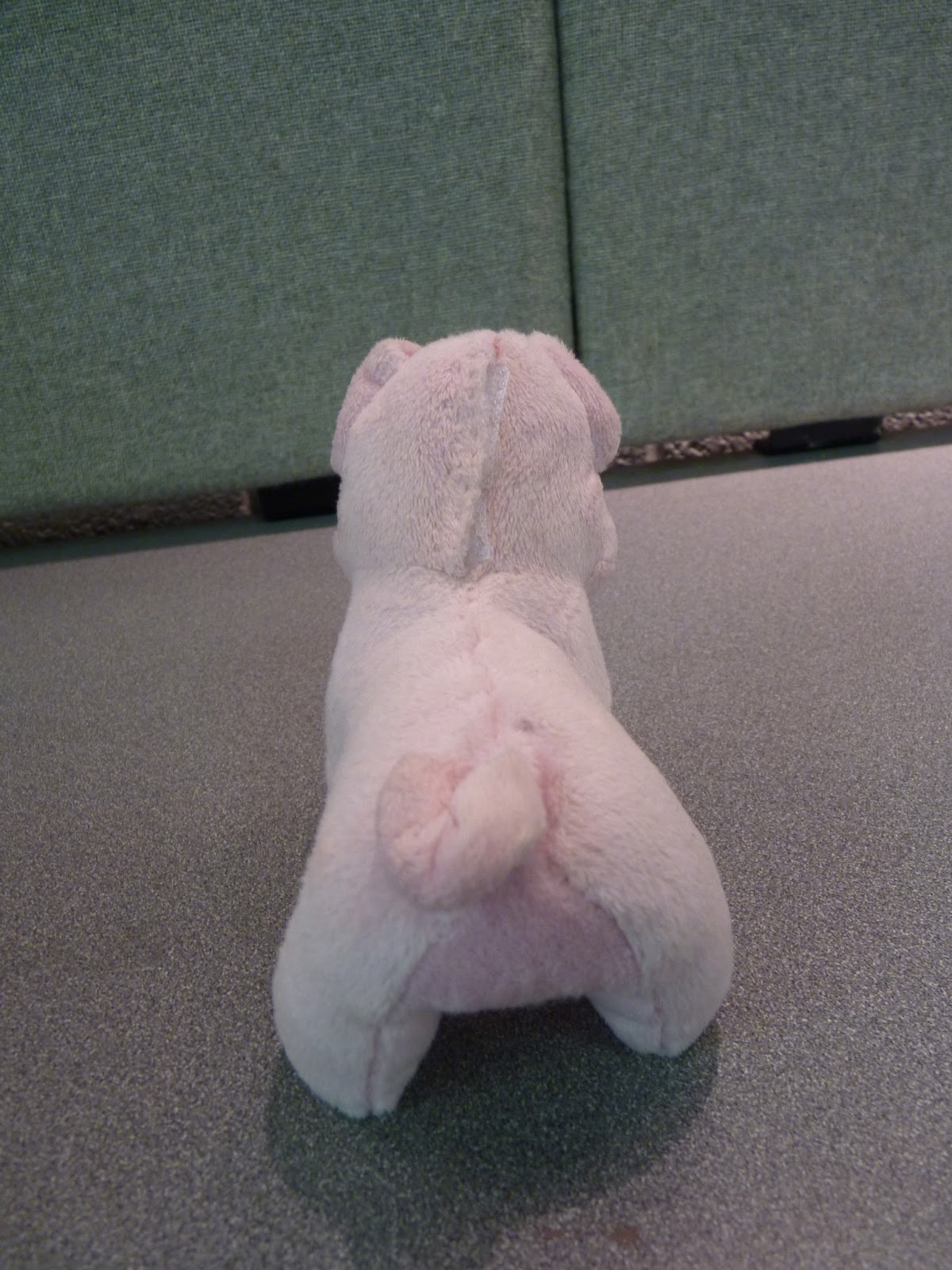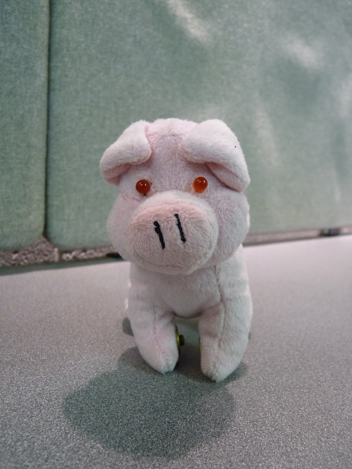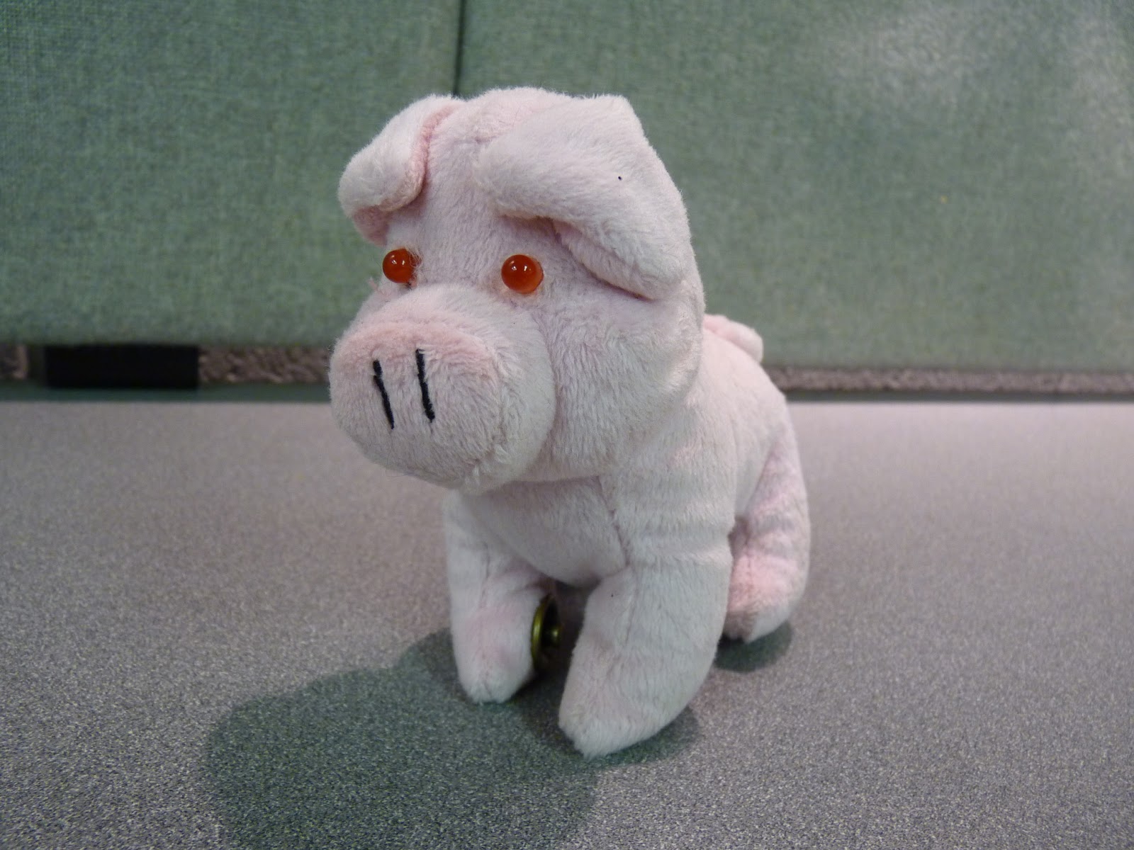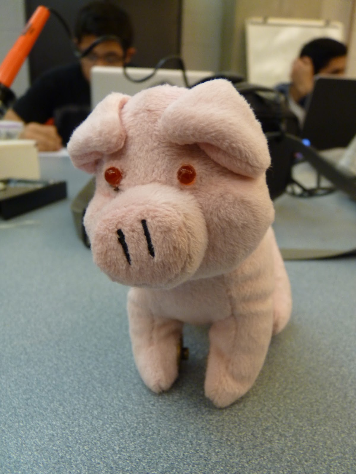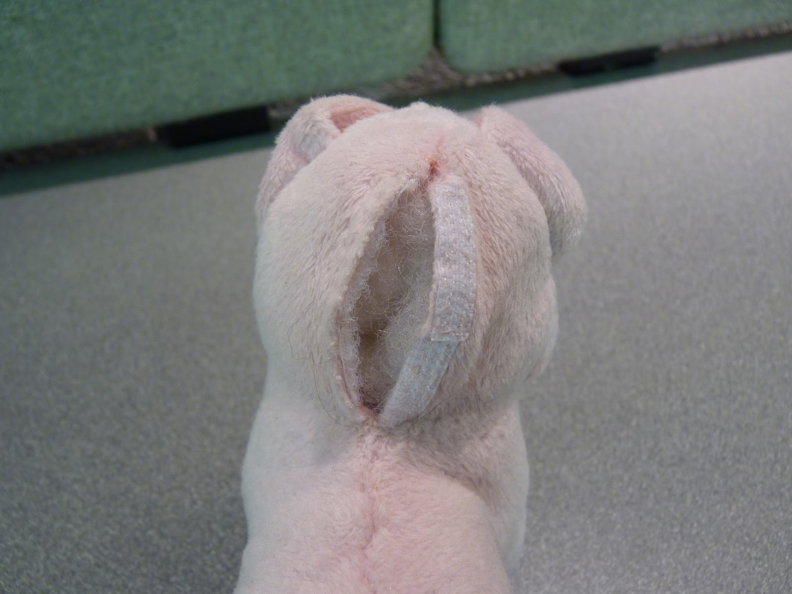 The Evil Pig stuffed animal uses brass snaps on its feet to complete the circuit to light the LEDs. The LEDs are connected in series to each other with a resistor and are powered by a 9-volt battery that rests in the belly of the pig. The negative lead to the battery is connected to the back of one of the brass snaps in a leg and the wire from the LEDs extends through the other leg of the pig attached to a brass snap. When the two snaps touch, it completes the circuit and lights the eyes of the pig.