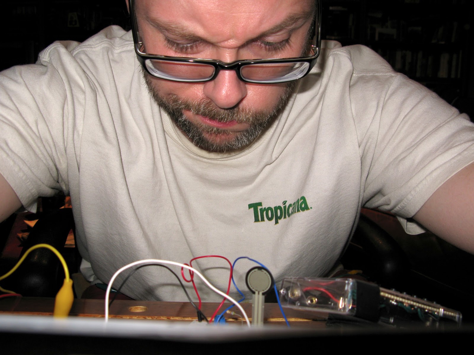 Now I know some of you were excited by the shoe-synth idea, but I hit a wall with several design and construction issues and I’ve decided to continue with the synth-in-a-box. I had problems with component consistency as well as construction stability of the shoes I tried. (My wife almost flipped when she saw me ready to mangle a pair of her shoes.) I’ve also spent way more money on “experimenting” than I had wanted to, and without much to show for it except for what I’ve learned during the process. I feel that this new design will still serve the basic purpose I had intended, though, and all without the erratic behavior of these cheap-o pressure switches. Decent pressure switches run $25 a piece, and I would’ve needed 5…and that’s too expensive for a component. Granted, I have new expenses with the re-design, but I’m certain I’ll be more pleased with the end result, as will the class since they will have the opportunity to play with a box rather than a smelly old shoe. Below are a few shots of the prototyping process. All the new parts/materials should be here mid-week, leaving me with a crazy-hectic weekend ahead.