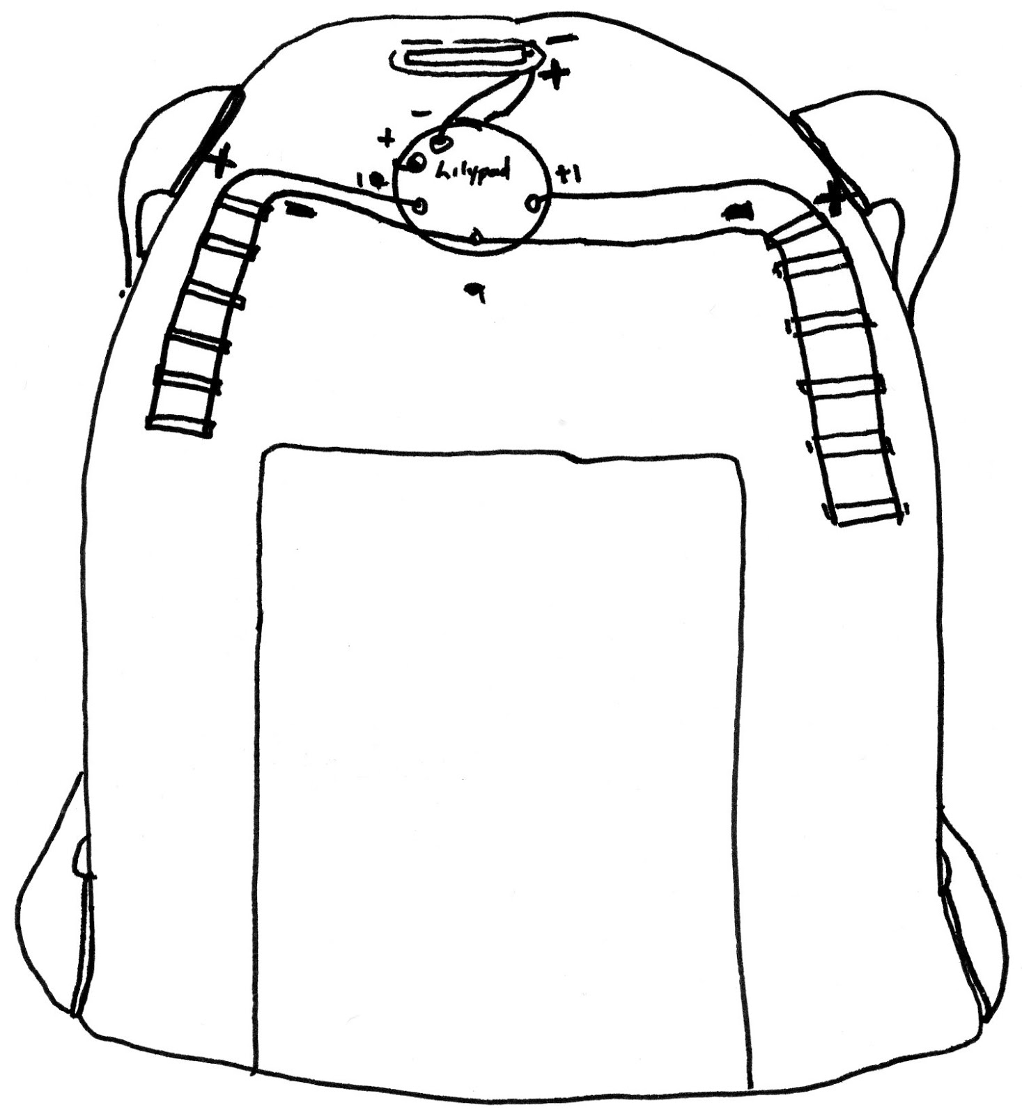 I created a wearable project in which the intent was to create a backpack that with a press of a button would control turn signals. I went through some setbacks and problems with the connections. Currently the backpack only flashes on the back left side. Below I have loaded my images, video, and code for what is presented.