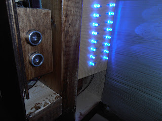 My final project was a waterfall using blue LED’s. The lights respond to a ping sensor in the front. When the sensor has something in front of it the lights will turn off and stay off until the object is moved. The sensor is set to change the lights when something is less than 46cm from it. That way the bottom of the piece or the floor won’t turn off the LEDs. The arduino was used to do that programming. The LED’s are individually connected to a resister on the negative leg. All of the resistors (the negative of the LED) are connected and then wired to one ground pin. The positive side of the LED’s are individually wired to separate digital output pins on the arduino (numbers 11 – 2). The code I used controlled what the sensor was doing after it measured a distance. A 9v battery powers the arduino, LED’s and sensor.