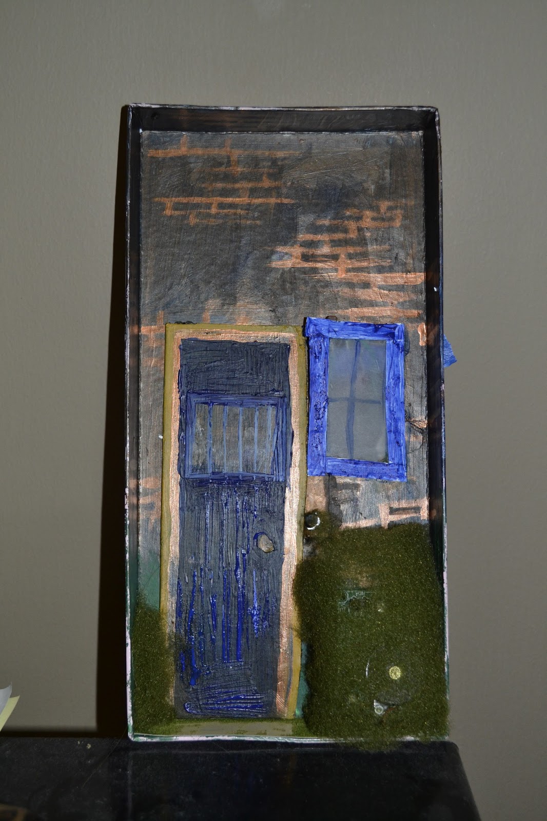 8. add in house details using white paper a outline box for window frame, doorbell frame and window flower pot. Paint and glue the house details on. Then cut out some ready sheet turf for the yard! add some scrapes and flowers for an unperfect yard lawn WHY? for character! DUH!