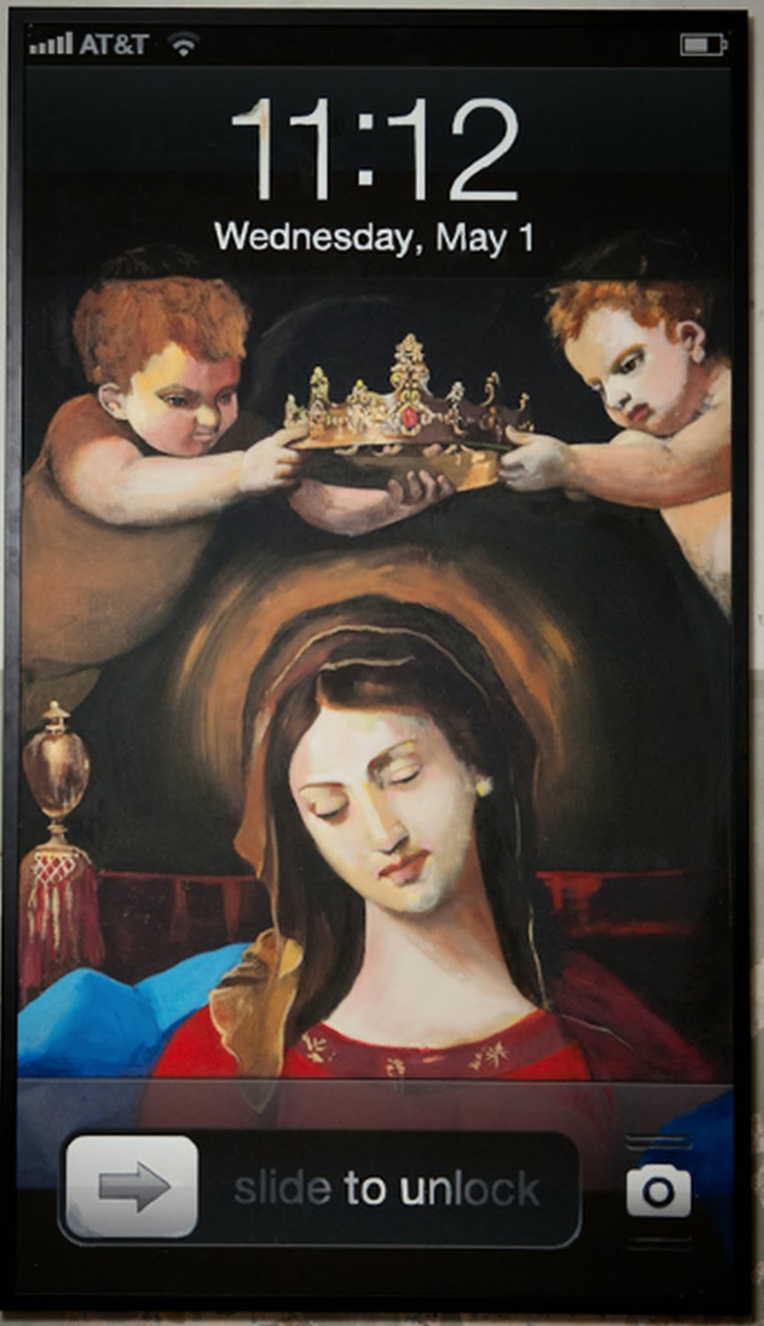 This piece is a giant oil painting thats done with such an attention to detail that they seem to be just a screen capture. The subject matter in her work always includes some form of modern day technology rendered in a way that they look like their digital counterparts while still drawing inspiration from art history. She embraces new ideas in technology like iPhone apps and social media in her work using oil paint in a way that always reminds the viewer of old classical paintings.