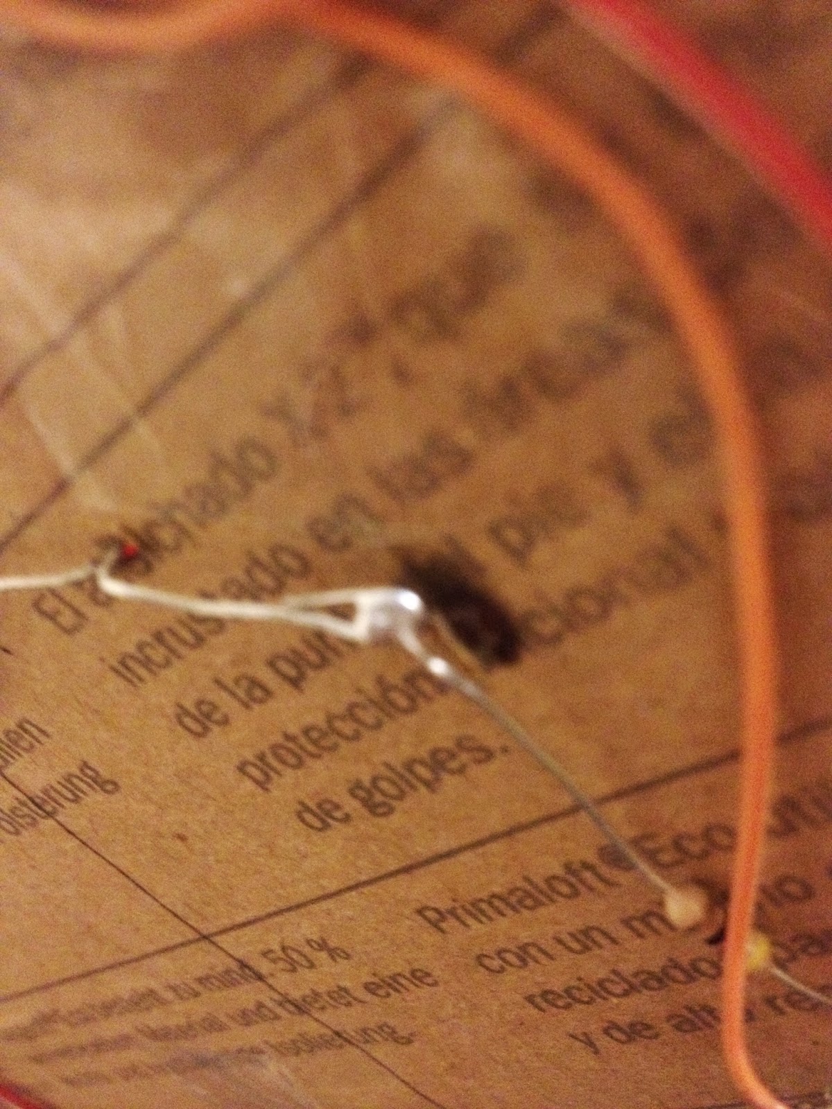 Once everything is securely attached, tape the circuit down with a scotch tape so it doesn’t get tanged. to create the switches, you’ll need to cut small pieces of tin foil and fold each one a couple of times (so it’s not flimsy) and wrap them around every wire that goes from either the batter or the LEDs. You’ll want to solder another wire (again coming either from the battery or the LEDs) to the electric tape. Test your circuit by pressing on each of your switches. When you don’t want the light to turn on, place small pieces of plastic foam on the electric tape to prevent it from touching the foil.