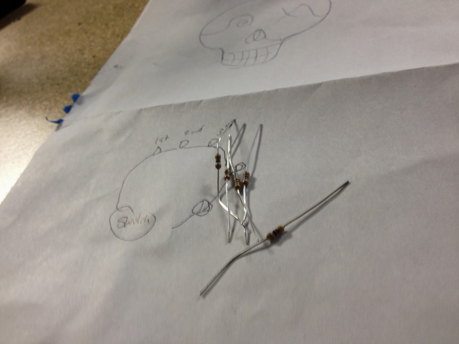 Also, use artist tape to secure the skull on the paper. Be sure to map out your LEDs exactly where you want them, don’t forget to place them on the cardboard one by one bending the LED legs on the other side.