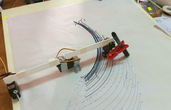 For my Interactive Project I decided to creating a drawing machine. Using Arduino and three servo motors as my primary sources of power, I will have a mechanism that draws on the paper. The planks connecting the servo motors will serve as shoulders to manipulate the the movement. As it shows in this picture, the mechanism will have a pen at its tip to draw on the paper. In order for the servos to move on the paper freely, I will have to attach small wheels to the bottom. The main issue i want to focus on is having the servos follow the movement equally so that the movement looks natural and creates abstract drawings.