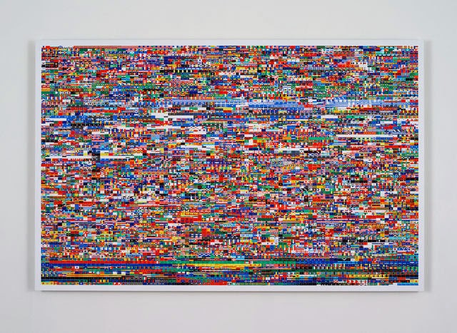According to the gallery which is selling the work it is an “inkjet print comprised of 7921 images created online by visitors to http://netflag.guggenheim.org” which absolutely fascinates me in terms of the detachment, yet supervision that is instilled in this project by the artist. The idea of the work creating itself through a set of parameters presupposed by an individual creates a wide range of modes of collaboration, new modes considering the expanse of technology. Aesthetically what Napier produces is beautiful and extremely complex. It holds a strange nostalgia for the moments when my computer has shorted out or a tv goes bad. It’s complex yet can be seen as a whole which relates back to the process through which it was created; a complex set of commands for a computer/website to create something singular through mass involvement.