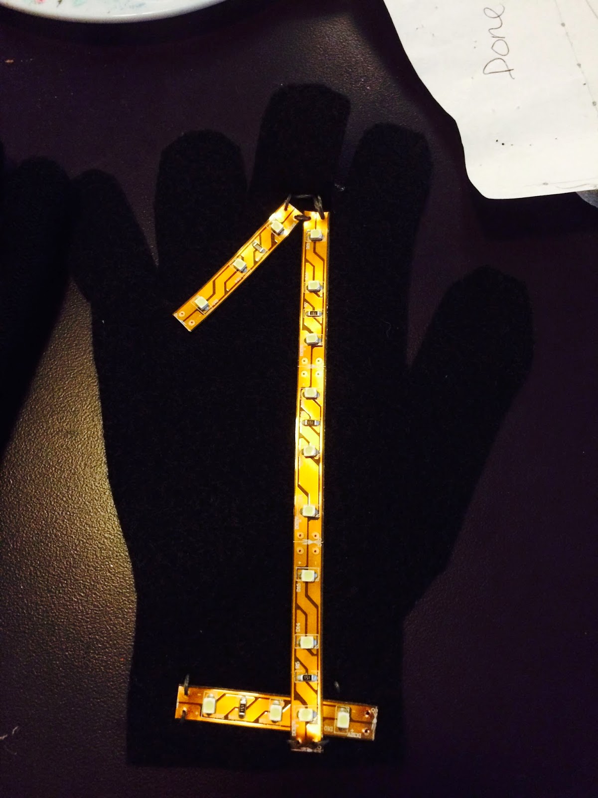 – Turn the gloves inside out and figure out how you will be wearing the glove and where the LEDs will show through.