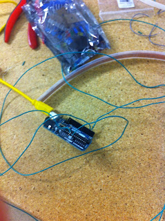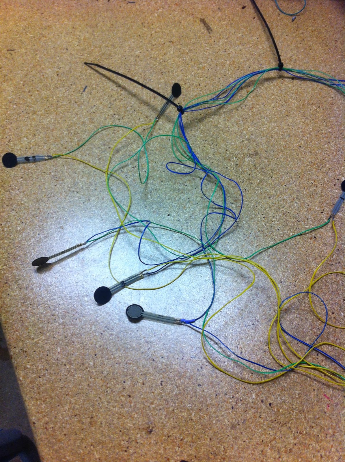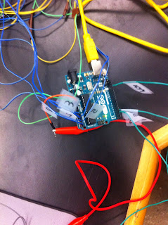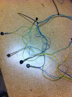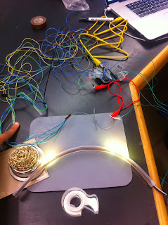 This is some of the process of my creating my headband. My goal is to make the headband light up when you touch different points on it. For instance, when I touch the headband sensor next to my temples, I want it to turn blue to represent a calm feeling. Right in front of the temples, I want the yellow LEDs to turn on, which will represent an active mind. The two pressure sensors on the front of the headband will turn on the red LEDs, representing mental energy.
