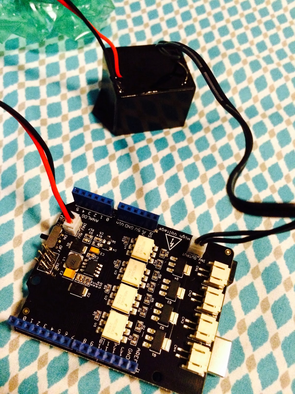 This shows the inverter still plugged in to the shield, but this time we have plugged in the lines from the end of the EL wire. I have placed a line in port one and port four because thats what my code was set up to do. I have done this for each set of gloves as well. The next step after would be to plug the Arduino into the computer and run the code. For now, the EL wire just lights up. I plan on adding some type of movement for the final project.