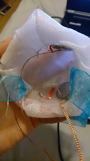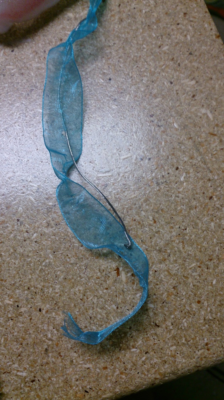 2. When you finish taping, cut some wires out, the length is up to you. When you have your desired length, cut out the ribbon. The ribbon should be slightly longer than the wire. When you have both ribbon and wire, pierce through one side of the ribbon, continue this until you have all of the wire covered, tape the ends. These are the tentacles.