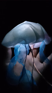 4. After connecting, connect the LED light to the 3 volt battery. Make sure to match positive to positive. Connect the tentacle to the other end of the LED. Tape the to the inside of the Jellyfish.