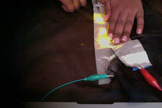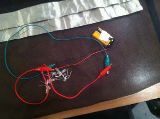 7. Now test your connections! The end result should be lights that flicker on and off based on movement. For a more permanate LED light up skirt, purchase flat lithium rechargeable batteries , conductive thread and flat LED’s!