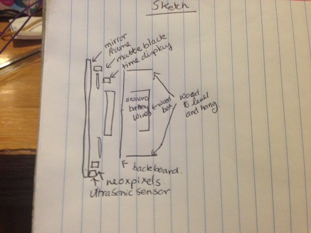 My Project 3 was to my prototype for my final project. I was a mirror that would light up when there was someone in front of it. Thus, I used the UltraSonic Sensor and the neopixels strip to program them together. For my final project, I will add onto that display the time using the one digit displays and put them behind the mirror. Due to budget contraints, instead of buying mylar to cover the glass and make my own mirror, I will the current mirror I have now and use a matte finish with paint to the make seamless and have small mirror with a cutout for the time display screen. I will display this and use the current box I have to store all the circuits, batteries and Arduino uno.