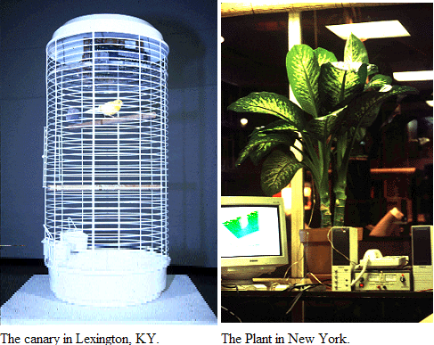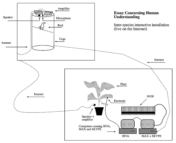 Essay Concerning Human Understanding was a long-distance sound installation created by Eduardo Kac and Ikuo Nakamura in 1994 that allowed a canary in Lexington, Kentucky to communicate with a philodendron plant 600 miles away in New York. A microphone and speaker connected to a circuit board was placed near the canary’s cage, which transmitted audio to an electrode attached to the plant’s leaf. This electrode also captured stimulus from the plant, and the entire communication loop was delivered through the telephone system.