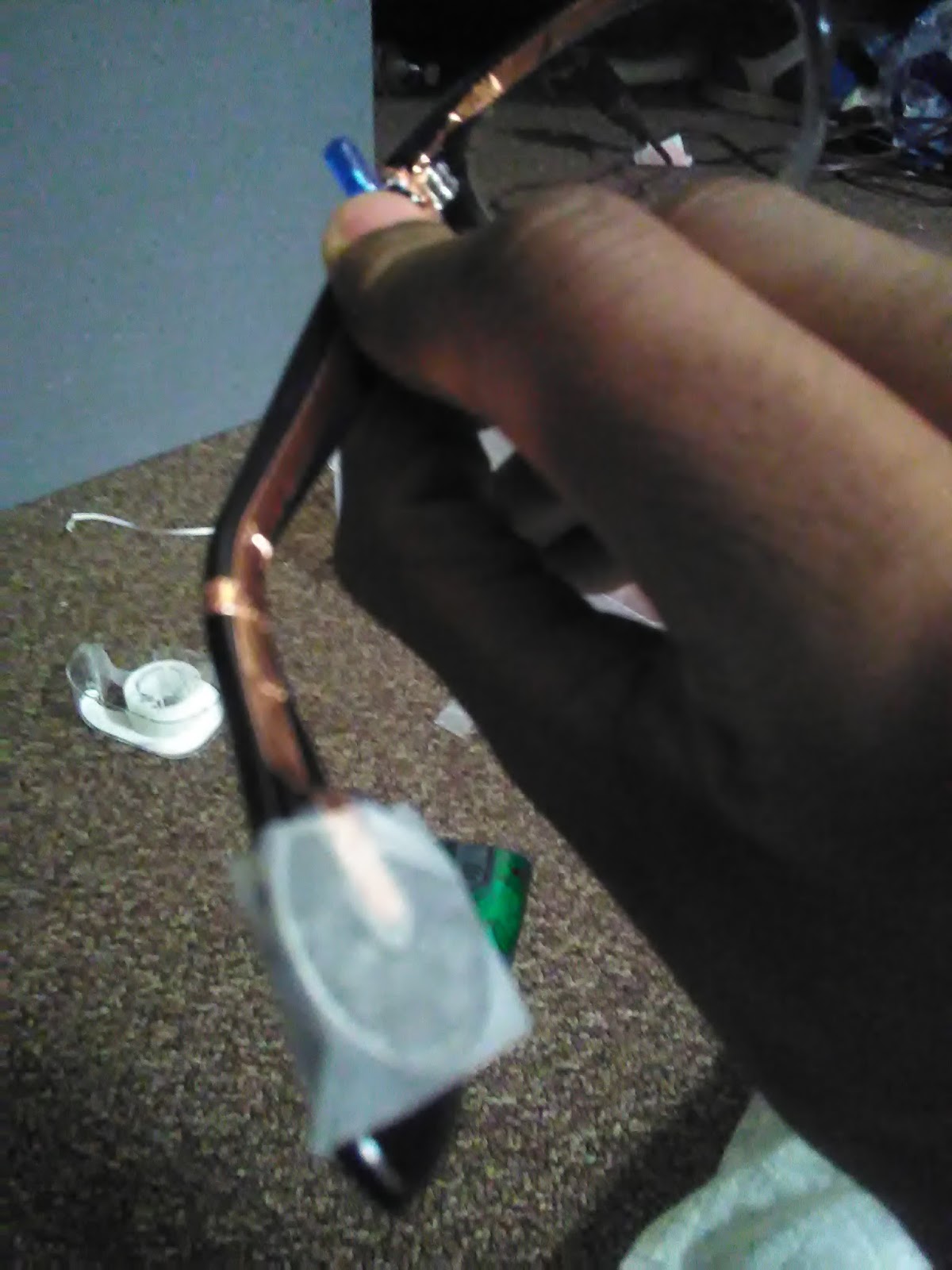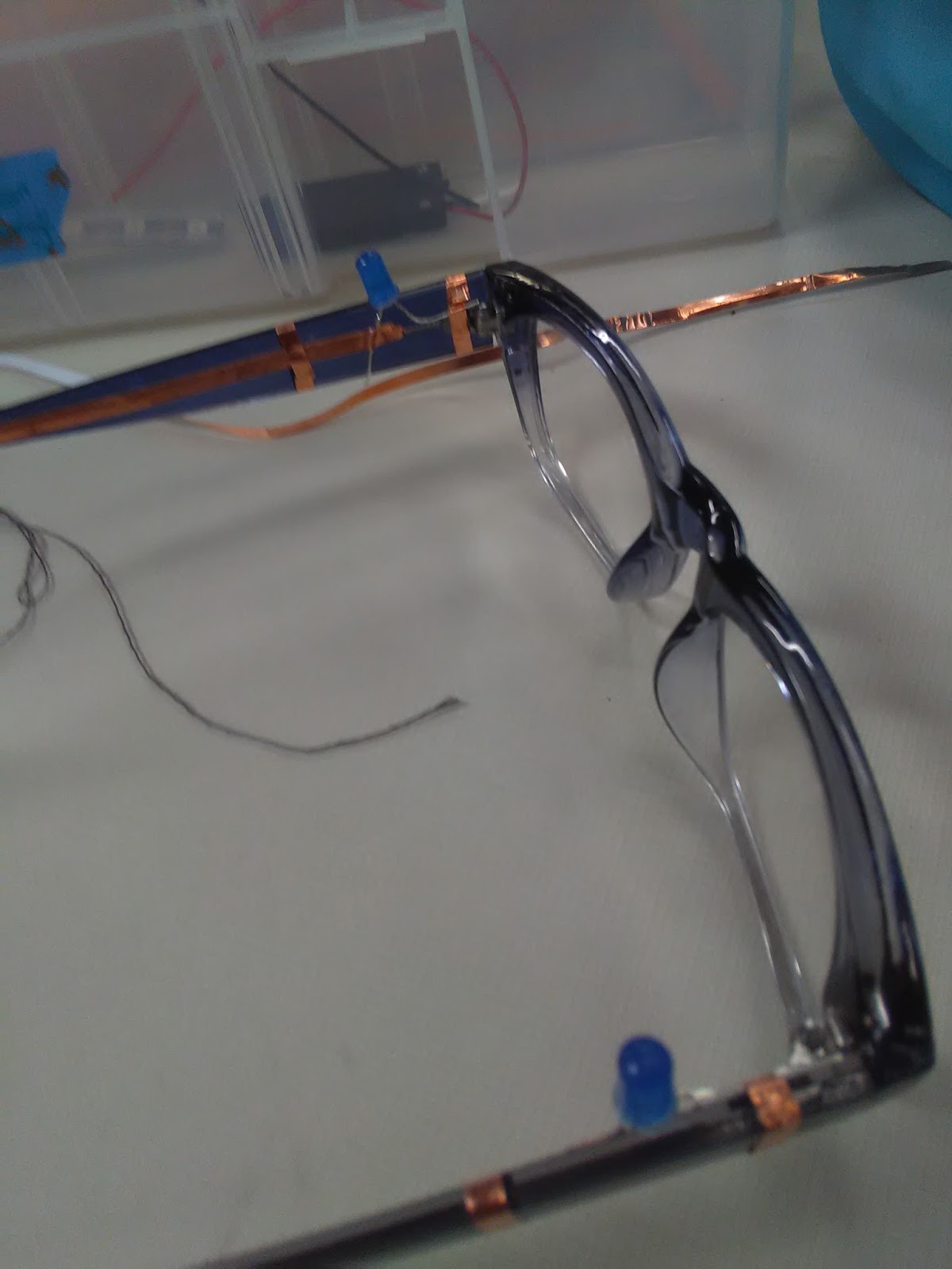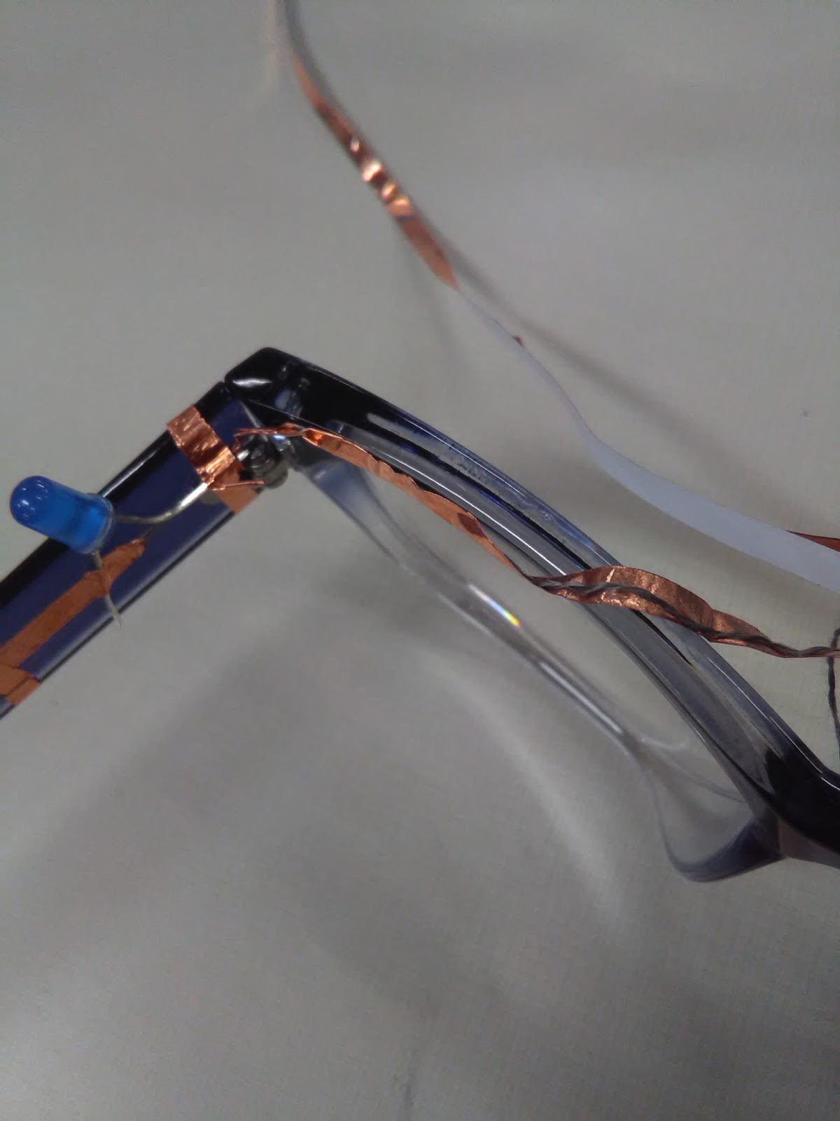 I wrapped copper tape around thread on the bridge of the glasses in order to connect the current from both sides of the glasses
