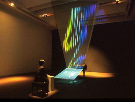 Toshio Iwai’s Piano as Image Media uses a grand piano and a trackball-as-interface to allow visitors to compose multi-colored visual melodies generated by the sounds that the piano produces. This piece stood out to me because the process of moving through stages of physical intervention, to visual/digital, back to physical, to audible, and finally, to visual seems unnecessarily complex to achieve what really is a very simple sound and light show.