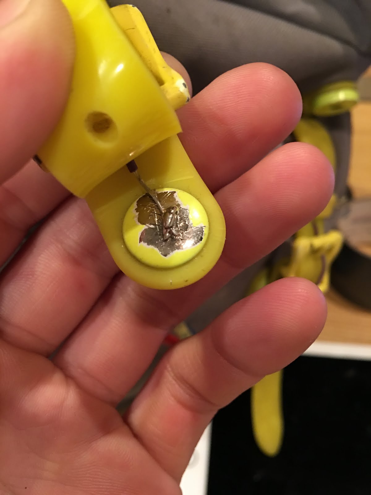 First I tested if the snaps were even conductive from front to back, in order to do this, I had to scrape the paint off of the snaps.