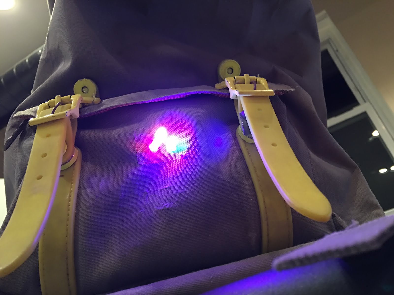 Next I soldered wires to the backs of the snaps inside the pocket. On the positive side I connected it to the LED, and on the negative side to the battery. Then I attached the lead of the LED to the other port on the battery and tested my circuit.