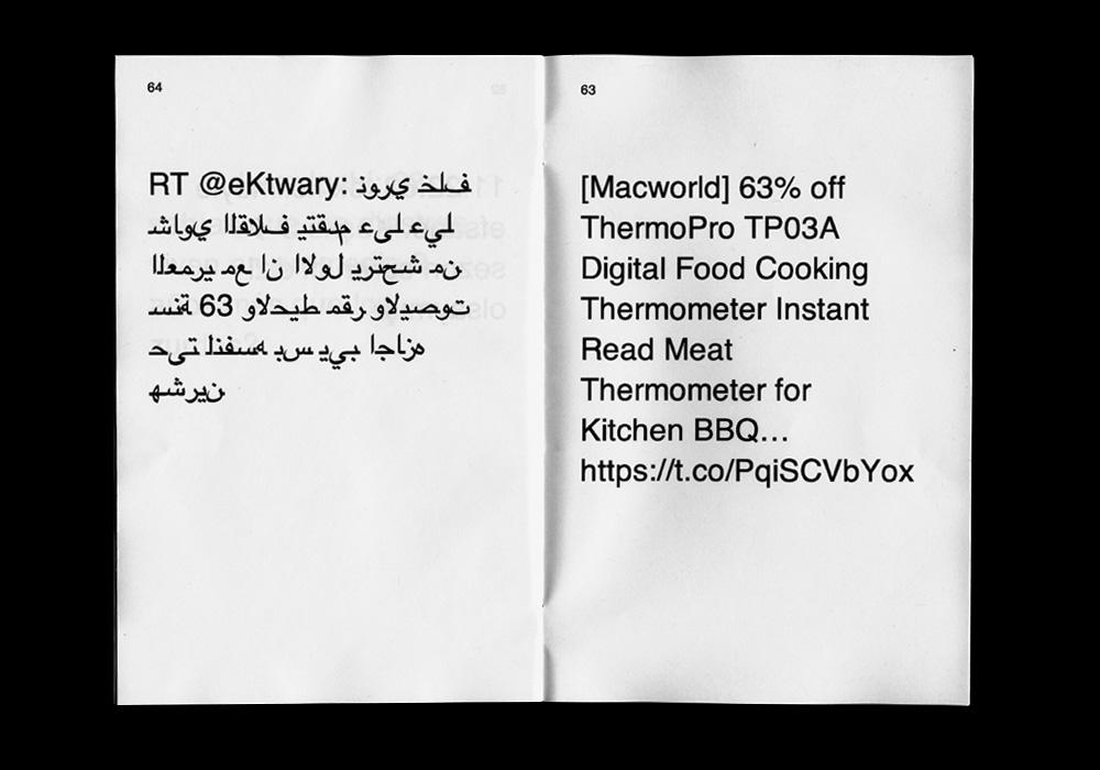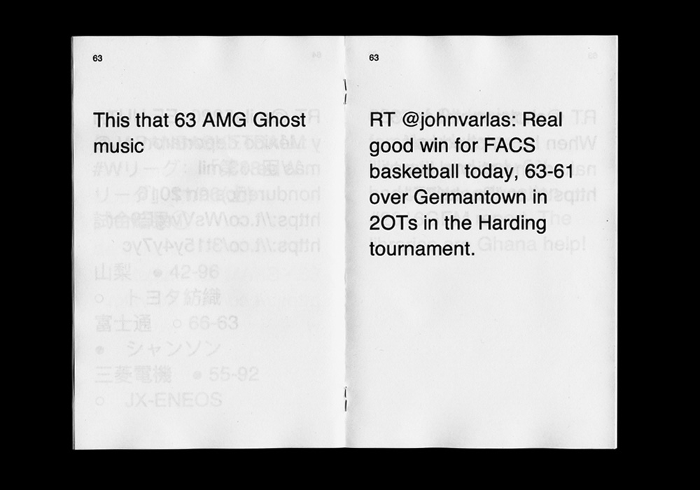 I was inspired by Cory Arcangel’s “Working on My Novel,” a twitter feed and book which compile tweets from various authors linked by their use of the phrase “working on my novel.” This project alludes to other forms of post-digital publishing that also ask questions about what it means to create a physical archive using content that was never conceived as such.