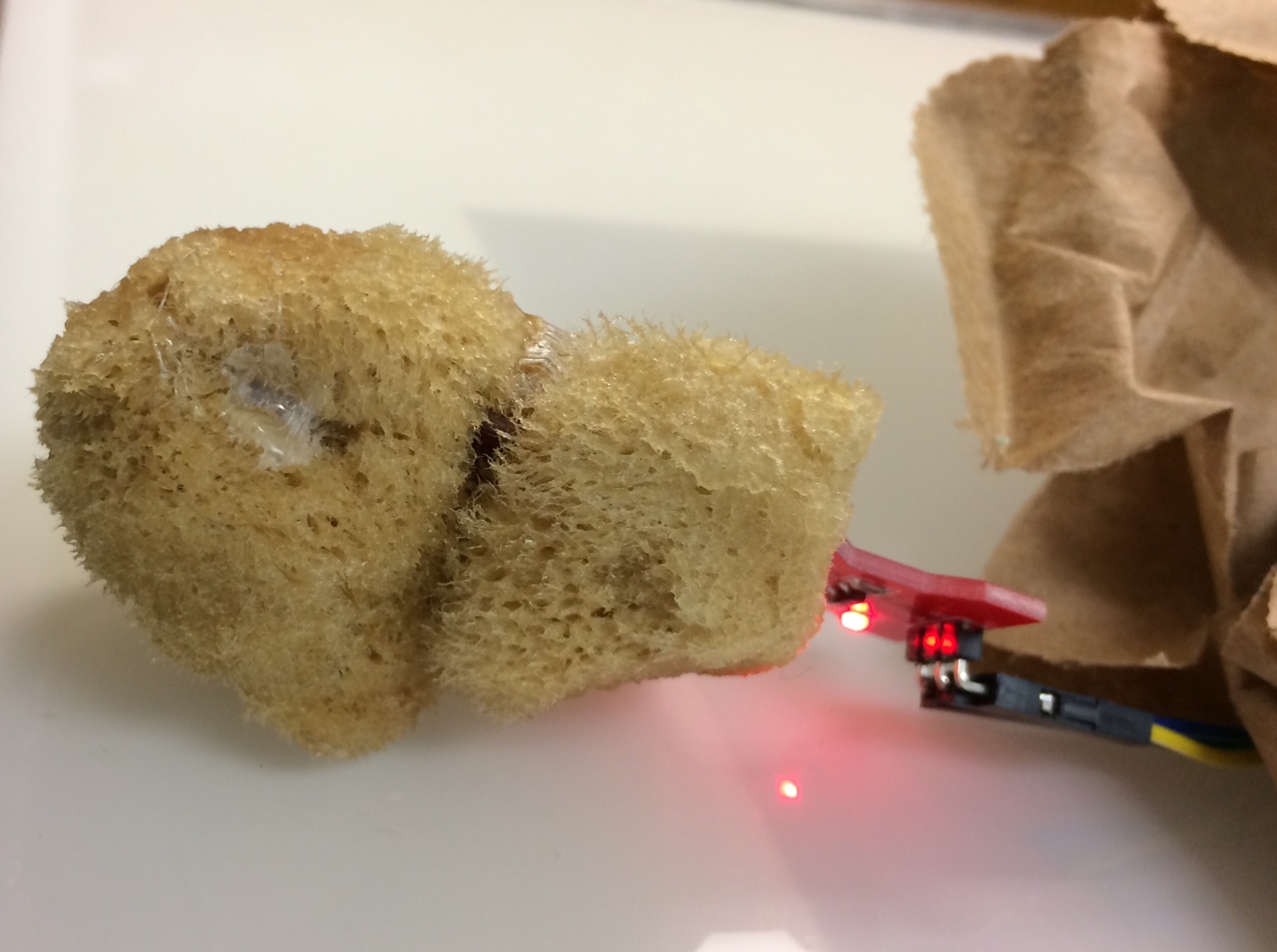 By gluing some sponges together and cutting a slit in the middle, I have a little pocket to soak the water sensor in.