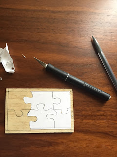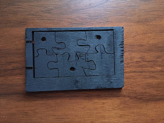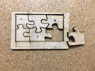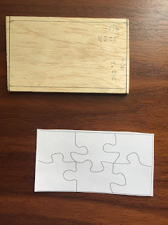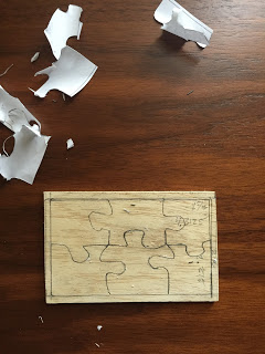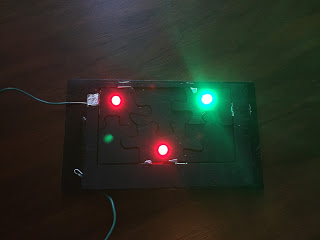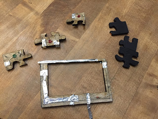 For my creative switch I chose to make a puzzle using a 9 volt battery and three red LEDs. I was able to find a small puzzle image on google and paste it to a piece 1/8″ thick wood I had lying around. I made an outline using an exacto knife and traced the outline with pencil. I originally was going to use a stroll saw to cut the pieces out but I was able to use the laser cutter in the lab, which worked out better than expected. After everything was cut I painted the puzzle black and drilled holes where I wanted the LEDs to fit. I chose to link the LEDs in a series to a 9 volt because it made the most sense with the amount of room I had to work with. I first tried copper tape to connect the circuit but didn’t have a solid connection through out. I then tried using just green wires, which I glued to the back of each puzzle piece and that didn’t work either. I ended up using tin foil and staples.