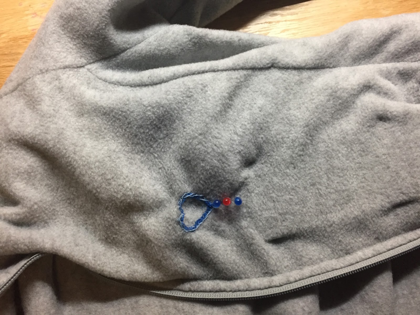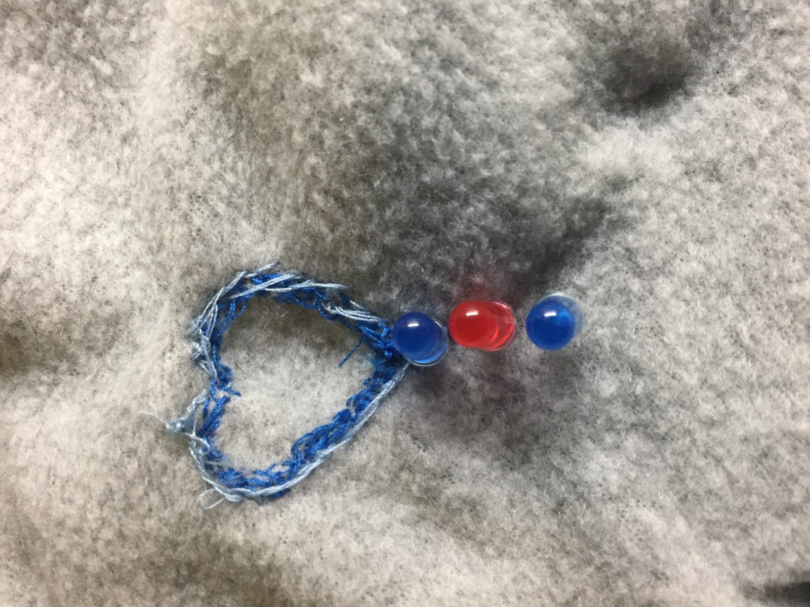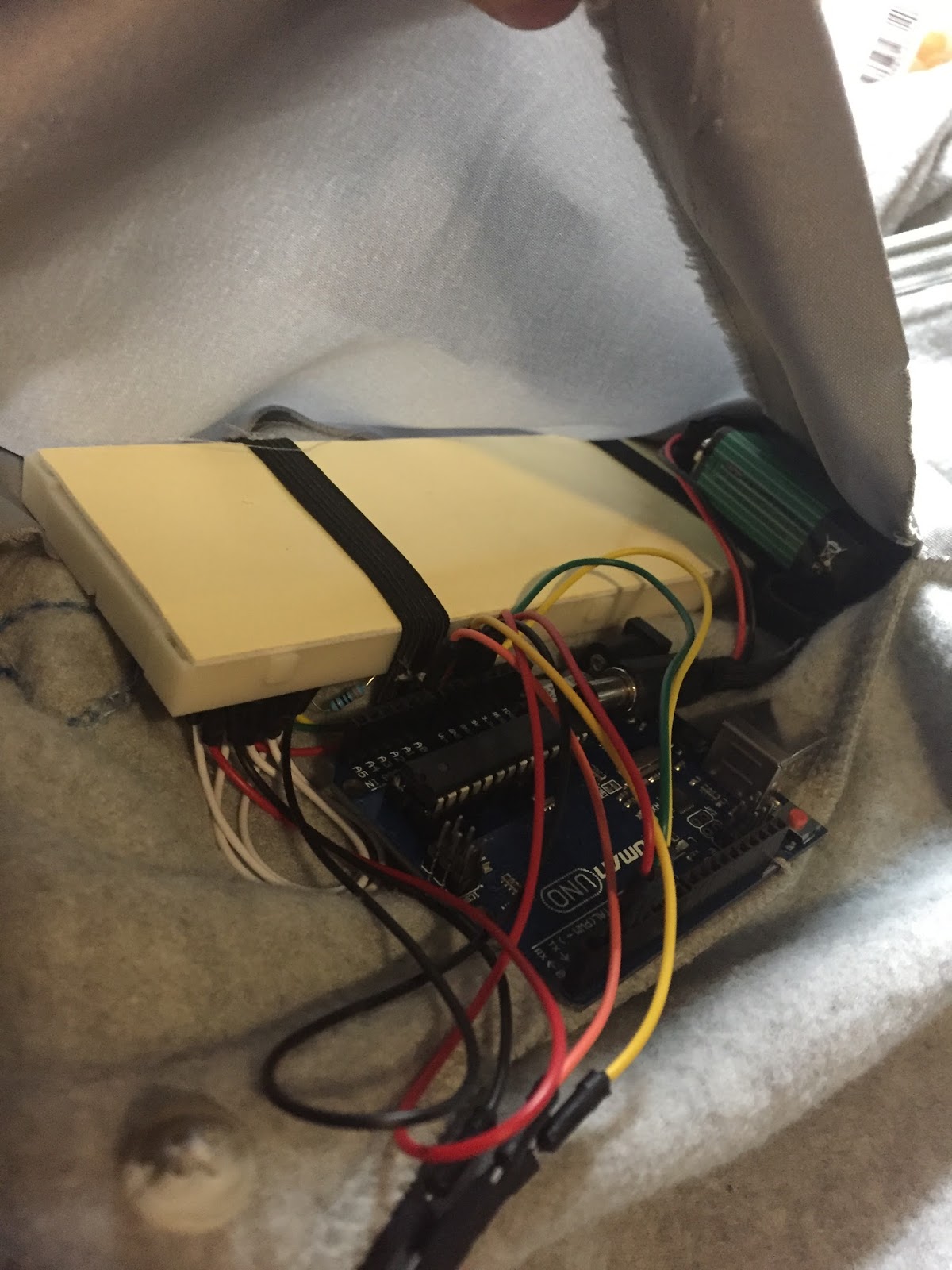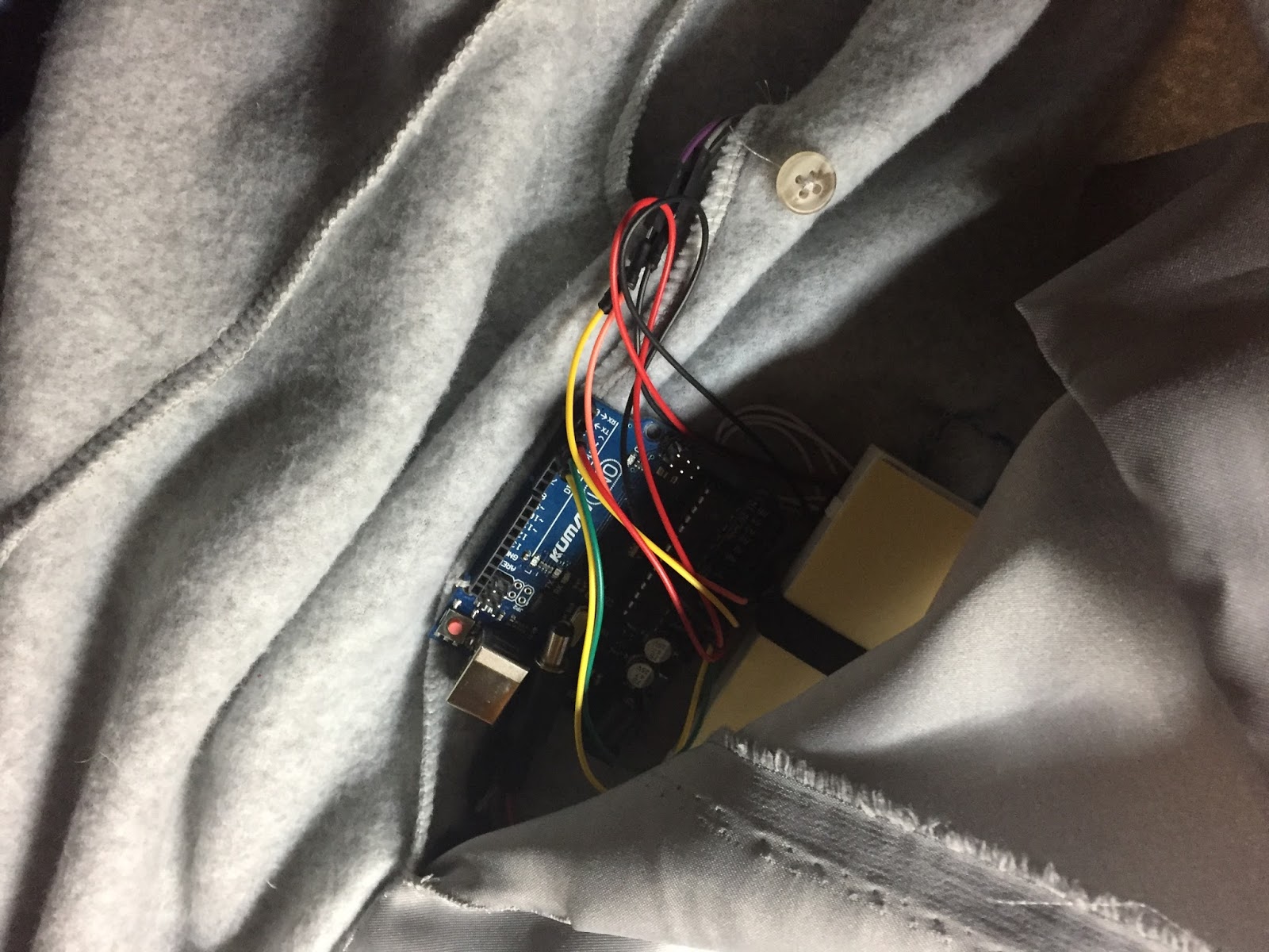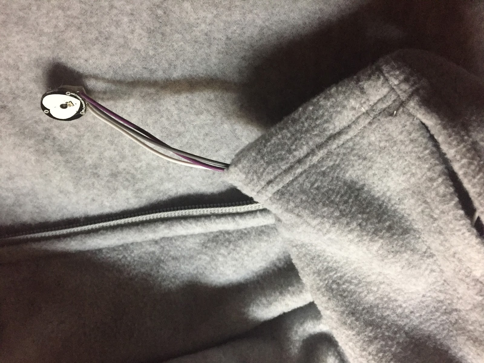 I put this into a jacket. The wires for the pulse sensor goes through the sleeve. The front of the jacket has a blue heart stitched into it. The LEDs drip down from the heart.