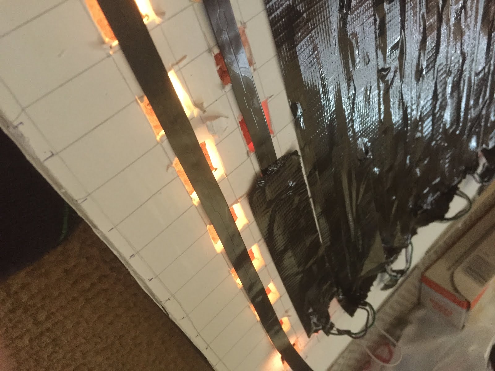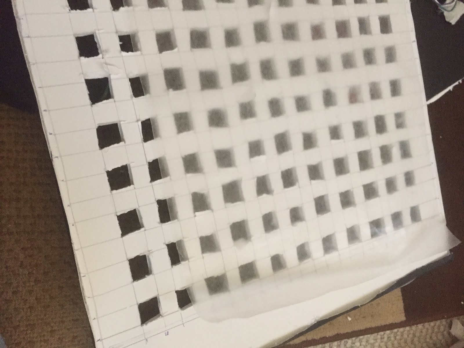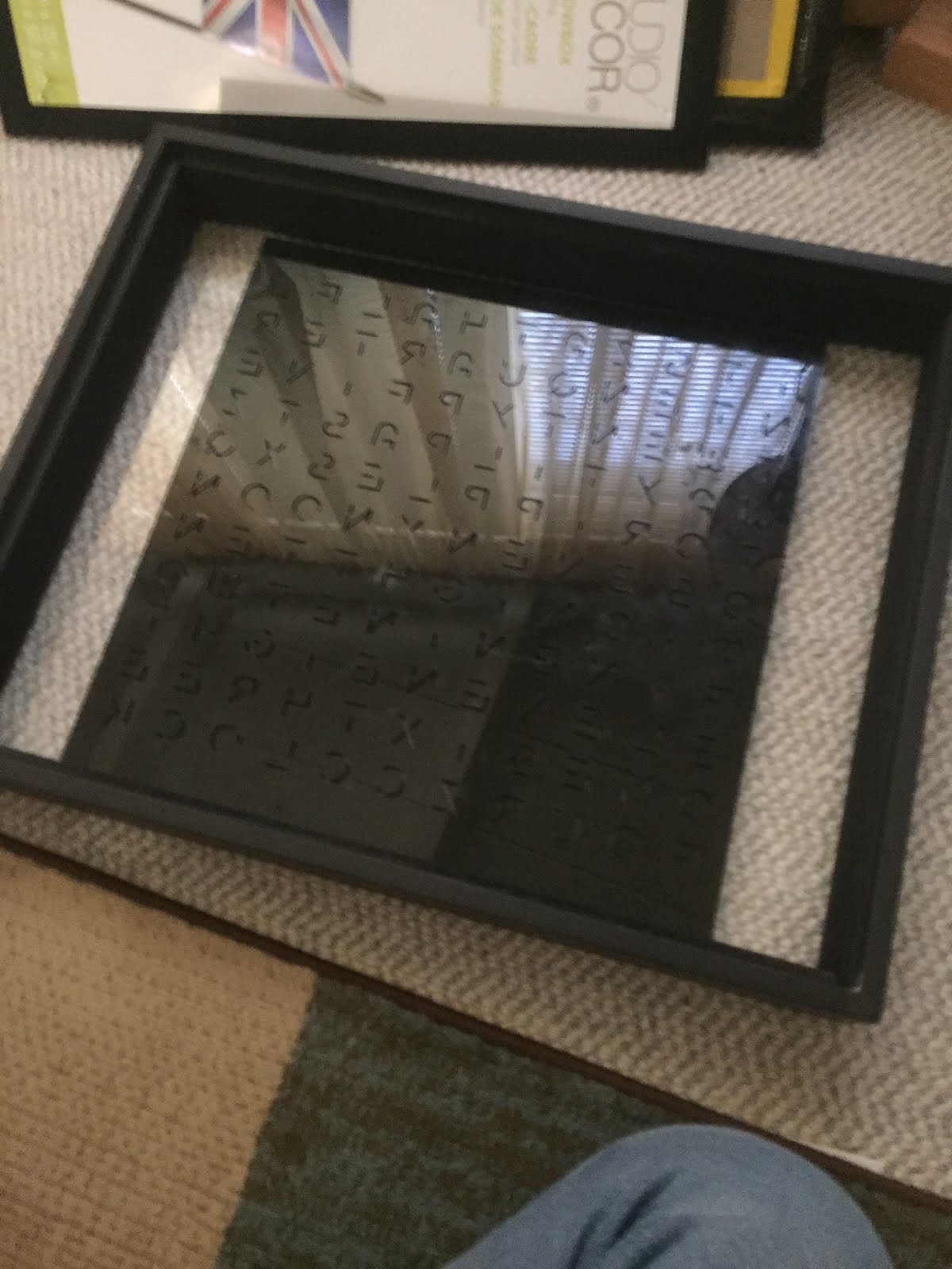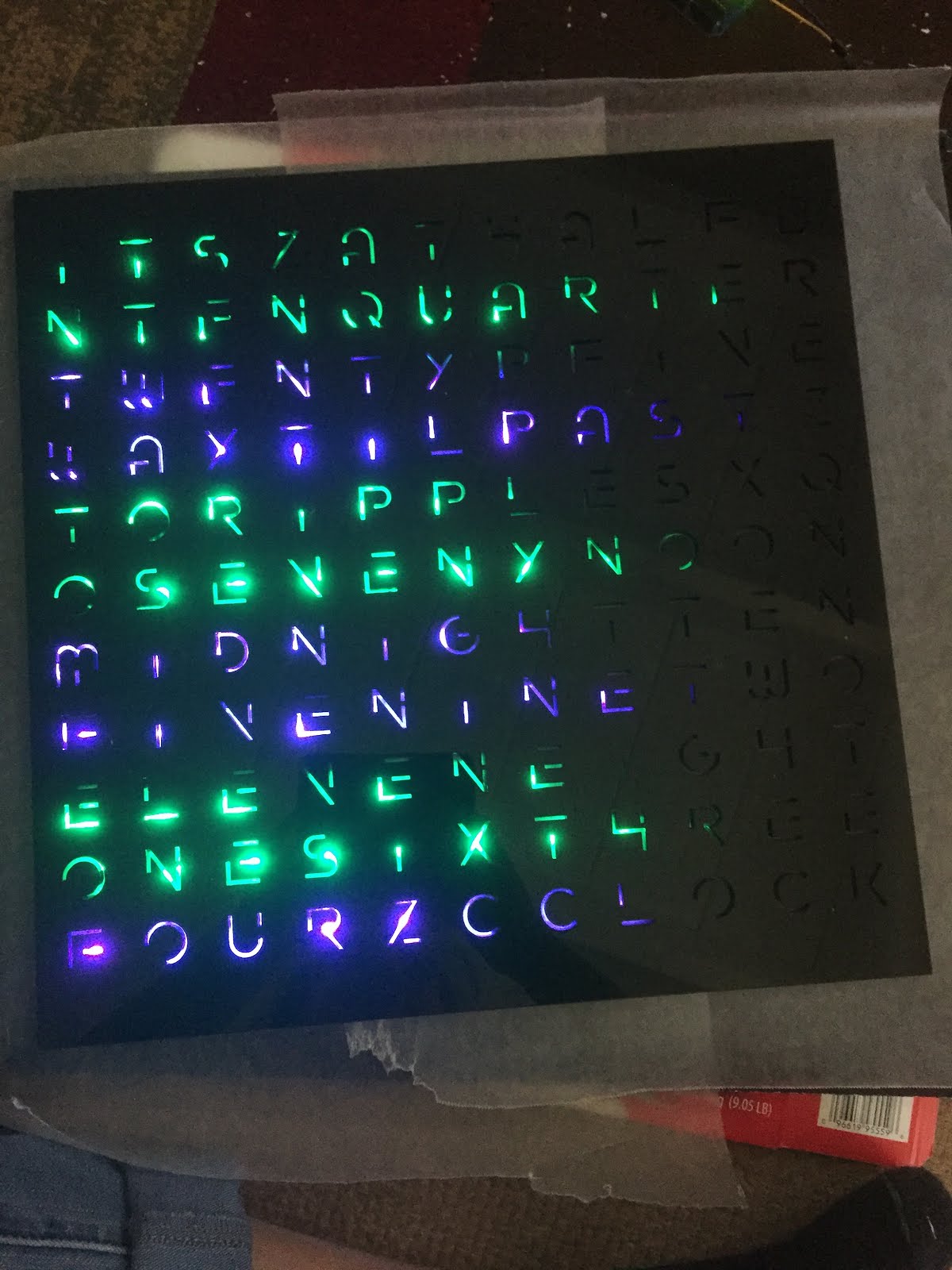 First we soldered a whole bunch of LEDs together to create a grid. Then laser cut the letters out from a piece of scrap black acrylic (shown below inside a frame).