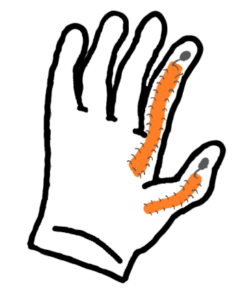 Next. Flip the glove inside out. Using the scissors, cut 2 strips of copper cloth. Place each strip along the finger of the glove where the copper thread pattern was sown earlier. Then attach the copper cloth strips to the glove by using the copper thread. The glove should look like the image to the left.