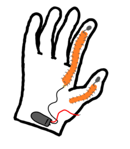 Start of by sowing the copper thread into the glove. One sow pattern should be on the tip of the index finger and the other should be on the top of the thumb. The sowing pattern does not matter; however, the copper thread pattern should be big enough to be visible enough and be able to make contact when the two fingers are touching.