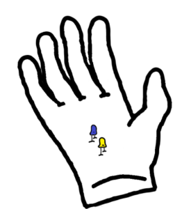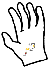 The way this works is because when the thumb and index finger touch, the circuit closes which allows the power from the battery loop around which lights up the LEDS.