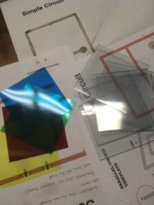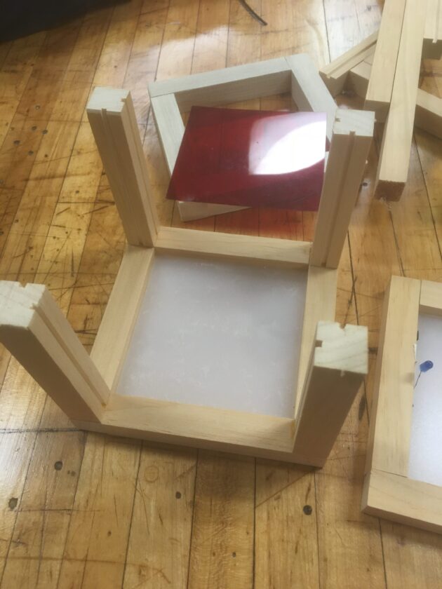 - CUT YOUR COLORED FILM SHEETS TO FIT. LEAVE SOME ROOM SO THEY CAN FIT IN THE LITTLE CUTS YOU MADE INTO THE FACES OF THE WOODEN COLUMNS. (EXCLUDE THE CLEAR PLASTIC SQUARES)