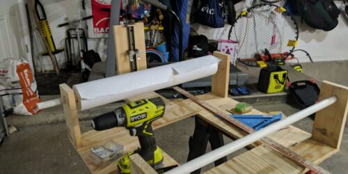 My axles are just 3/4 inch PVC pipe. Here you can see the whole pipe before I split it in two. In the end, each was 33 inches long, providing plenty of excess on either side. All I needed here was to slide the two axles into the existing holes and then the basic frame was mostly complete. The last piece was an extension to mount my linear slide on: