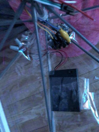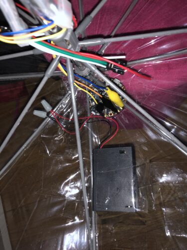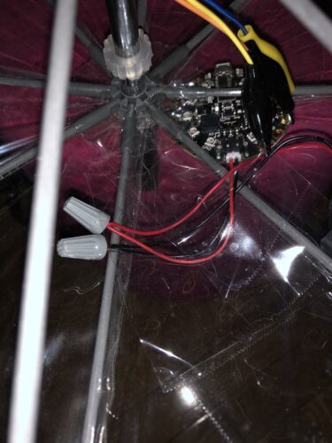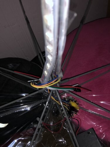 The final step is to set this all up on the umbrella. I stuck the playground under the bars in the umbrella so that it could stay in place. I kept the alligator clips away from the bar so they would not fall off. I tapped the battery pack not too far away from it. Then I took the LED strip and taped it to the handle. Hold the LED strip tightly and straight upon the handle. I used a medium piece of tape so that it would wrap around at least 2 to three times to hold it together. I repeated this until I got to the end. I did not want to cut the strip so I just folded it so that it would allow me to tape the rest of the strip to the other side. I taped the rest until it held up by itself and tucked the rest of the wire on the opposite end of the led strip away with the other wires. Turn it on while its raining and then you have your rain detecting light up umbrella.