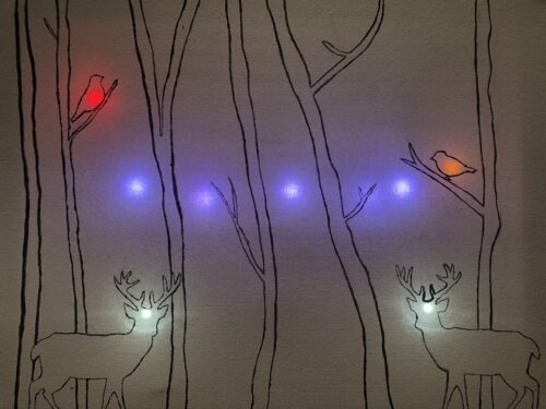 //The leds behind the two birds and the antelers of the deer will light up with sound