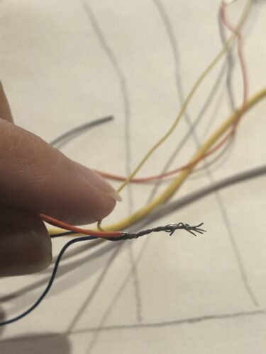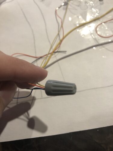 For each LED, cut and strip two wires of approximately 7 inches. Cut and strip an extra wire of approximately 4 inches. This will be the ground wire. Solder one end of the first wire to the male end of an alligator clip with a male end and the other end to the positive leg of the LED. Clip the alligator clip to an I/O pin on the Circuit Playground Express (I used pins A2, A3, A5, and A7). Solder one end of the second wire to the negative end of the LED. Gather the other end of the second wire for all the LEDs and one end of the ground wire and twist them together. Take a wire nut and screw it on the twisted wires.